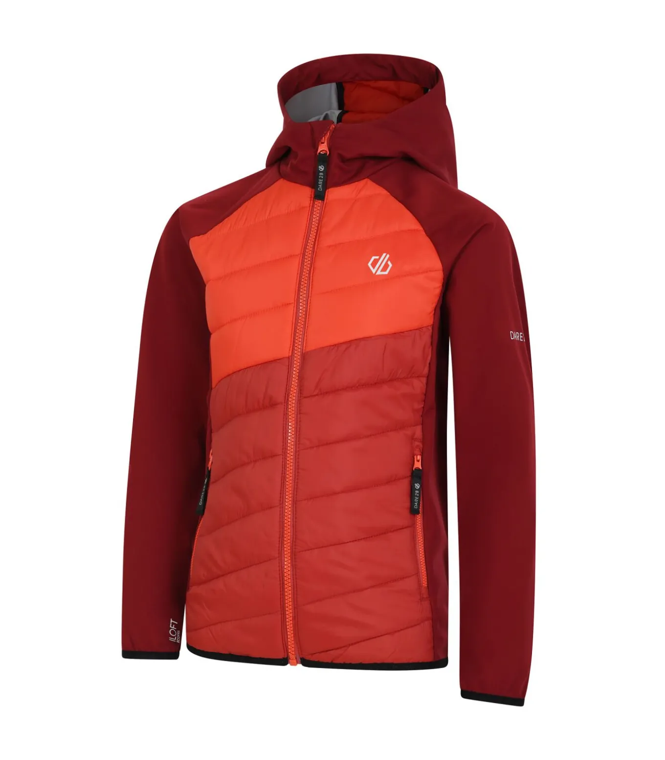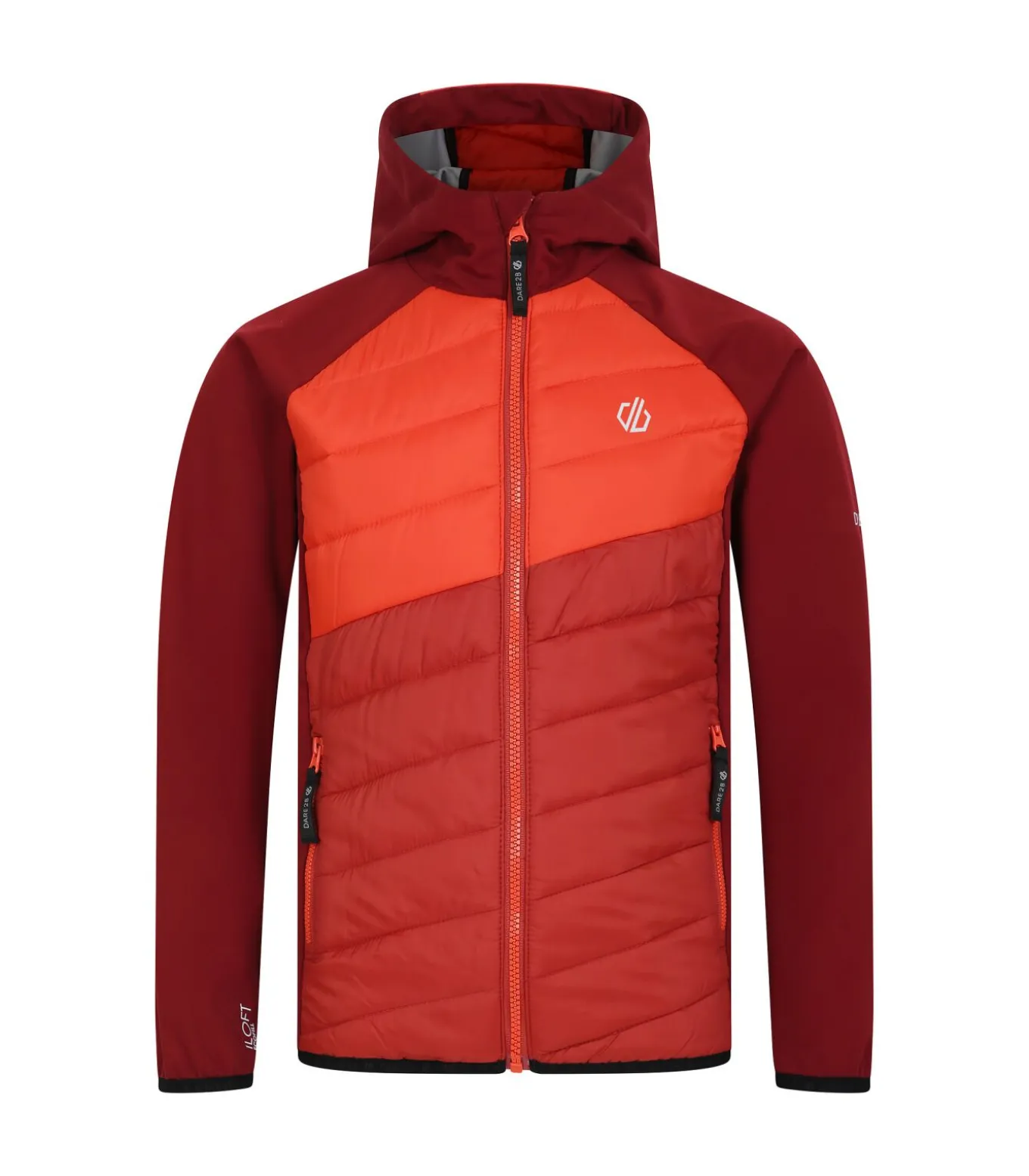 Deze hybride jas van Dare 2B Children’s/Kids is ontworpen om op ontdekkingstocht te gaan. Het heeft ecodown isolatie en softshell stretchstof voor lichtgewicht warmte en mobiliteit. Contrasterende details, logo’s en bedrukte mouwen zorgen voor extra visuele aantrekkingskracht. De stoftechnologieën omvatten ARED 15/15 ademend vermogen en waterdichtheid met ILUS D–Lab verwerking. De bescherming bestaat uit een kinbeschermer, ritsbescherming aan de binnenkant en padding. De hals met capuchon heeft een contrasterende voering en bevestigde capuchon. Twee zijzakken met ritsen bieden opbergruimte. Een rits over de hele lengte zorgt voor verstelbare ventilatie. Stretchboorden bij de manchetten en zoom ondersteunen de bewegingsvrijheid. Duurzaamheid is een prioriteit door het gebruik van gerecyclede materialen bij de constructie.