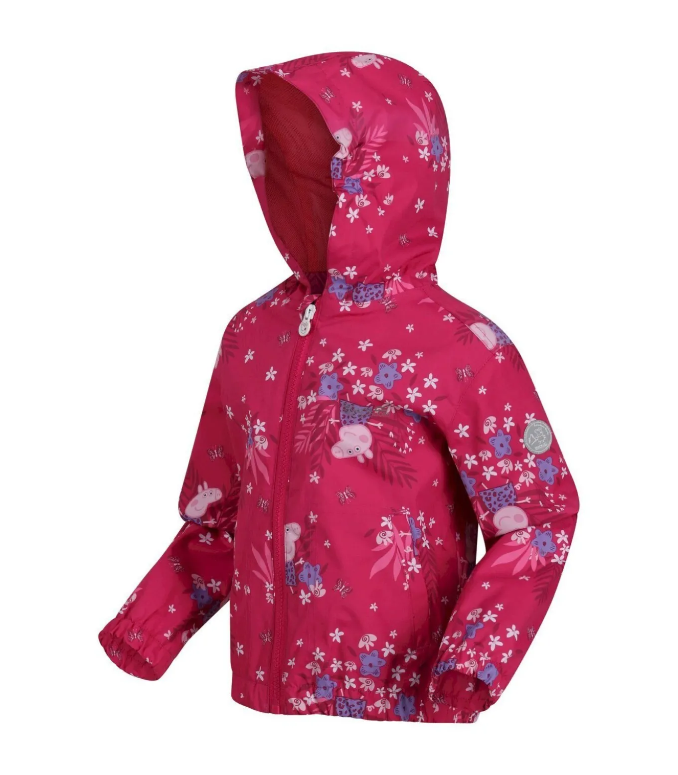 Deze kinderjas van Regatta is officieel gelicenseerde Peppa Pig–kleding. Gemaakt van 100% polyester met een Hydrafort voering en mesh en taffeta materialen. Het all–over printontwerp is voorzien van vlinders, bloemen, planten en het Peppa Pig–logo. Extra functies zijn een gevoerde binnenkant, bedrukt naamlabel, reflecterende afwerking, gesealde naden, getapete naden en een DWR–afwerking waardoor de jas volledig waterdicht is. De capuchon heeft een elastische manchet en een vastgegroeide capuchon met elastiek. Twee zakken aan de onderkant en een volledige ritssluiting bieden opbergruimte en gemak bij het aankleden. Een elastische zoom helpt de elementen buiten te sluiten. Deze hoogwaardige en functionele kinderjas zal zeker een favoriet zijn van elke Peppa Pig fan.