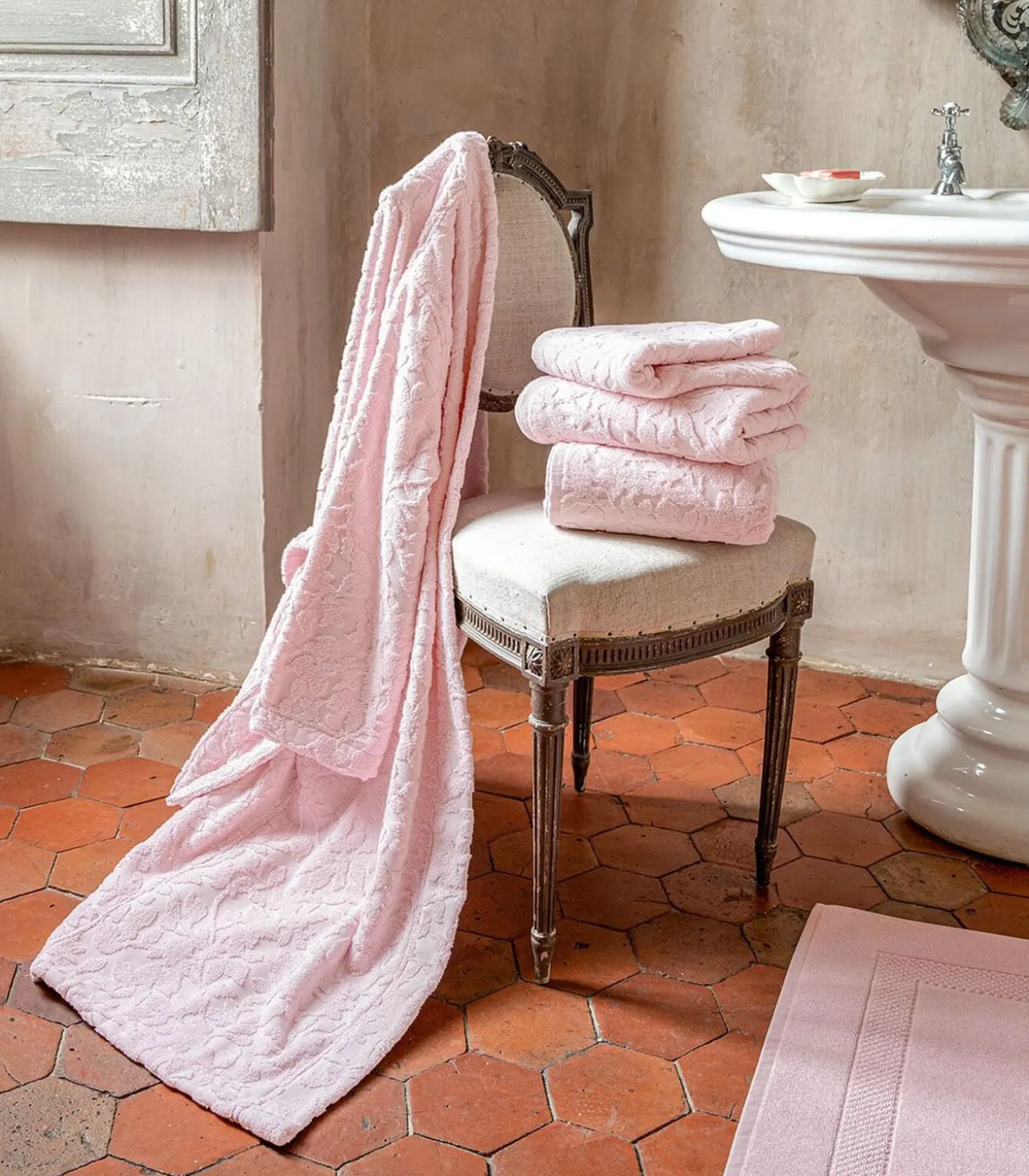 Het gewicht van 550 g/m² en de bouclette badstof van 100% gekamde katoen zorgen voor zachtheid en absorberend vermogen.