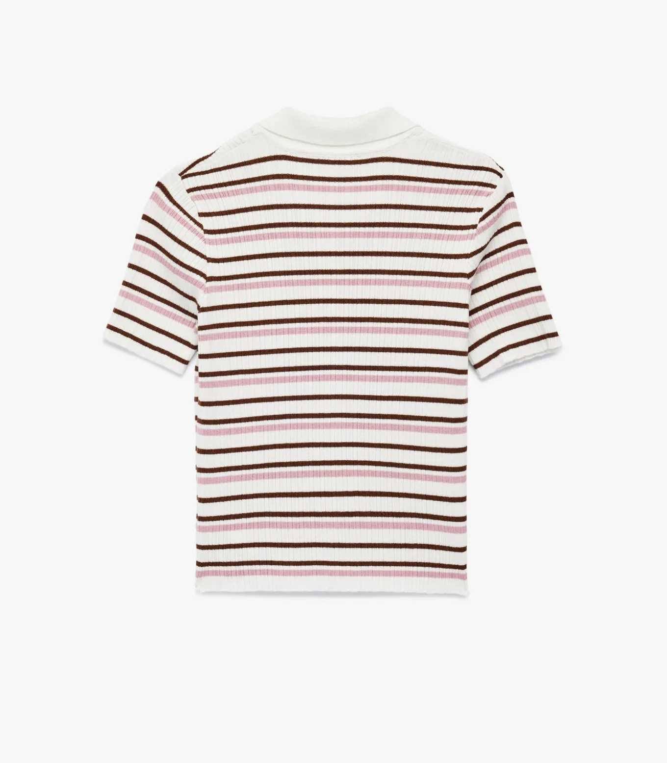 Gebreide blouse met strepen, polo–kraag met knoopdetail en korte mouwen.