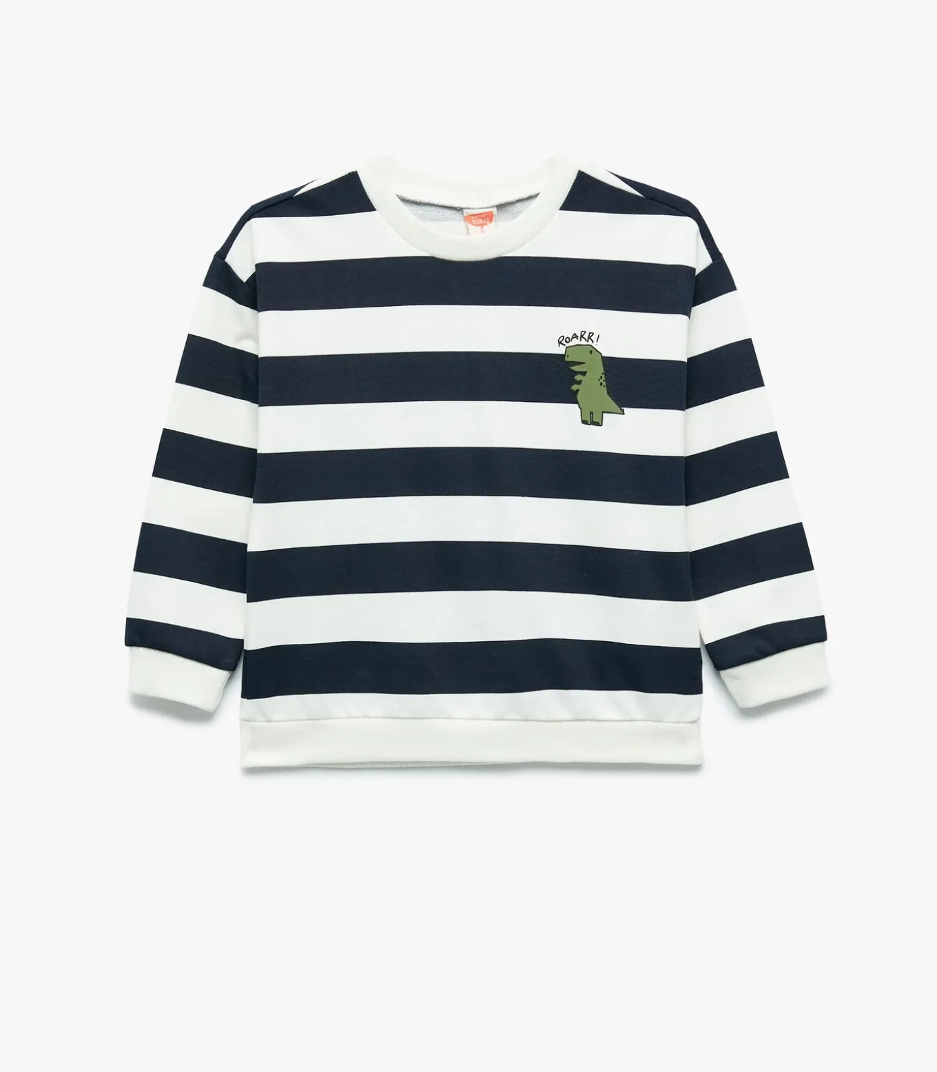 Deze gestreepte sweater voor baby’s is perfect voor alledaags gebruik. Met een schattige dino–print en gemaakt van 100% katoen, biedt het uitzonderlijk comfort voor je kleintje. De ronde hals en lange mouwen zorgen voor een aangename pasvorm, waardoor het ideaal is voor dagelijks spelplezier. Bovendien voelt de zachte, katoen stof prettig aan op de huid van je baby.