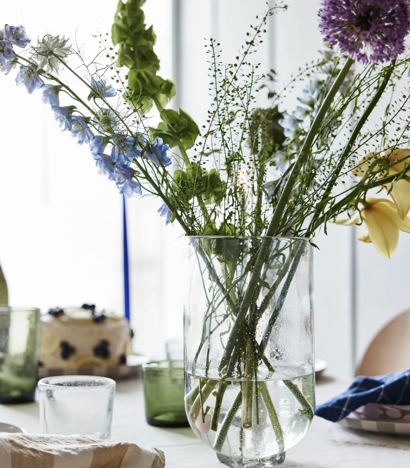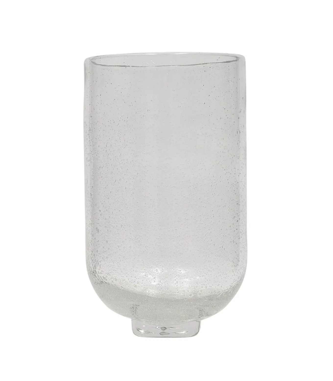 De glazen Kuki–vaas heeft bubbels die een vleugje eigenzinnigheid toevoegen aan het minimalistische ontwerp. De strakke vorm voegt een speels element toe aan de tijdloze esthetiek en combineert functionaliteit met elegantie. Perfect om bloemen in te zetten of als los decoratief stuk. Omdat elke vaas mondgeblazen is, varieert de grootte, wat bijdraagt aan zijn unieke charme.