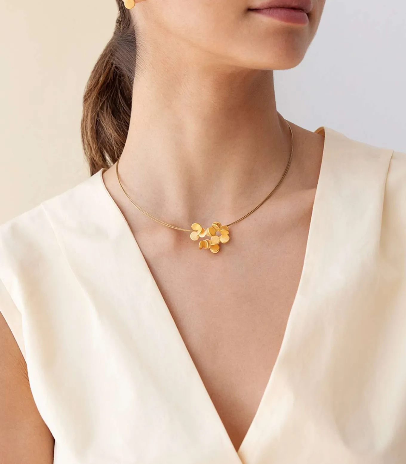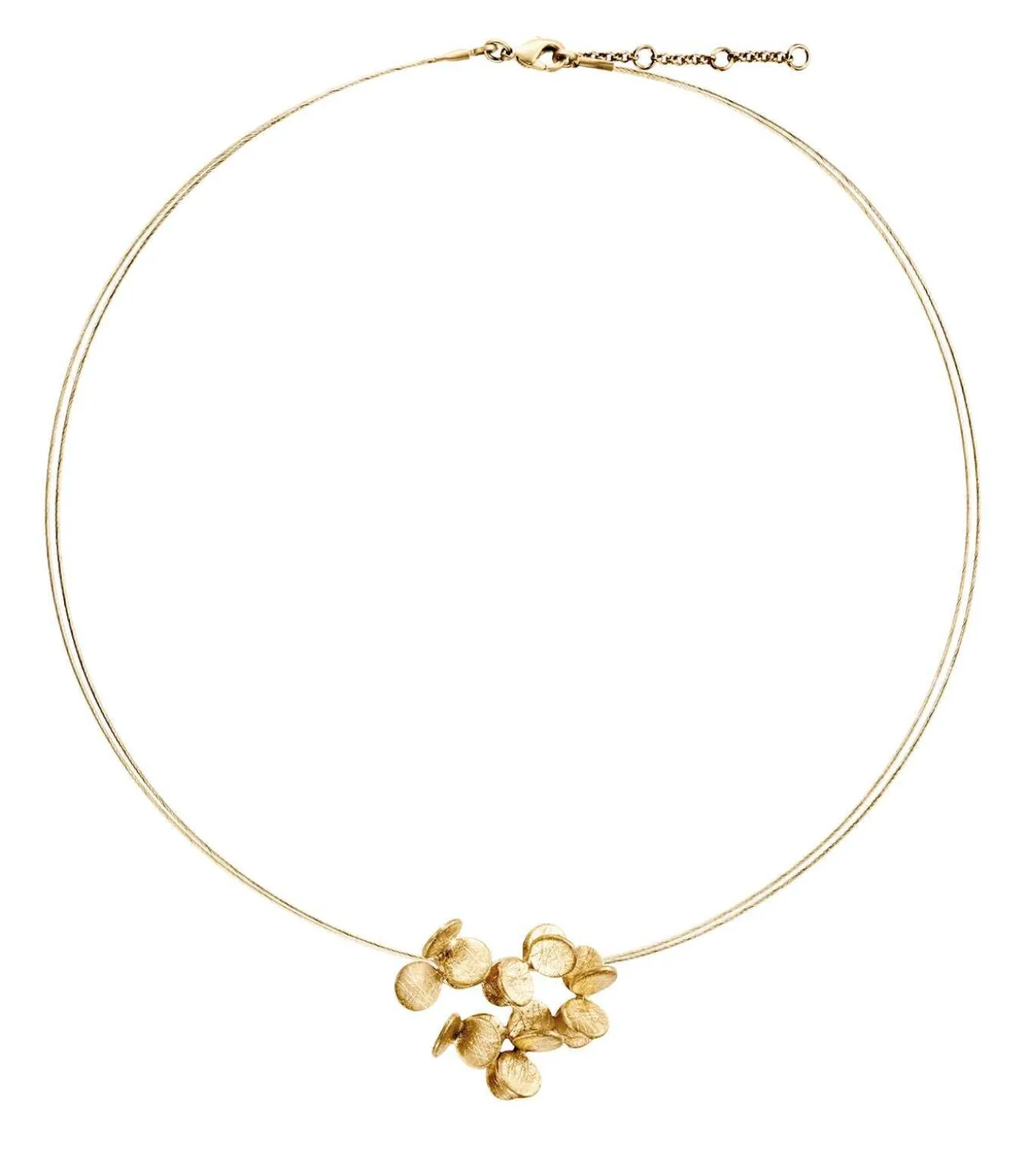 Choker van mat, met de hand bewerkt metaal, verguld met 24–karaats goud, met glanzende uiteinden. Kleine hanger met een ontwerp van kleine cirkels die elkaar overlappen. Dubbele vergulde stalen ketting. Karabijnsluiting en verlengkettinkje.