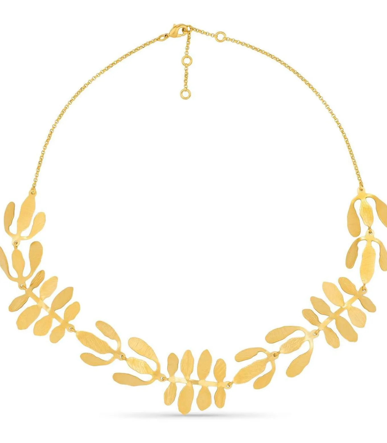 Vergulde ketting met organische vormen die de bladeren en bloemen van het mediterrane woud uitbeelden. Texturen en vormen roepen een bucolisch, natuurlijk en origineel universum op. Stuk van verguld messing met een met de hand gekraste 24–karaats gouden laag. Karabijnsluiting met verlengketting.