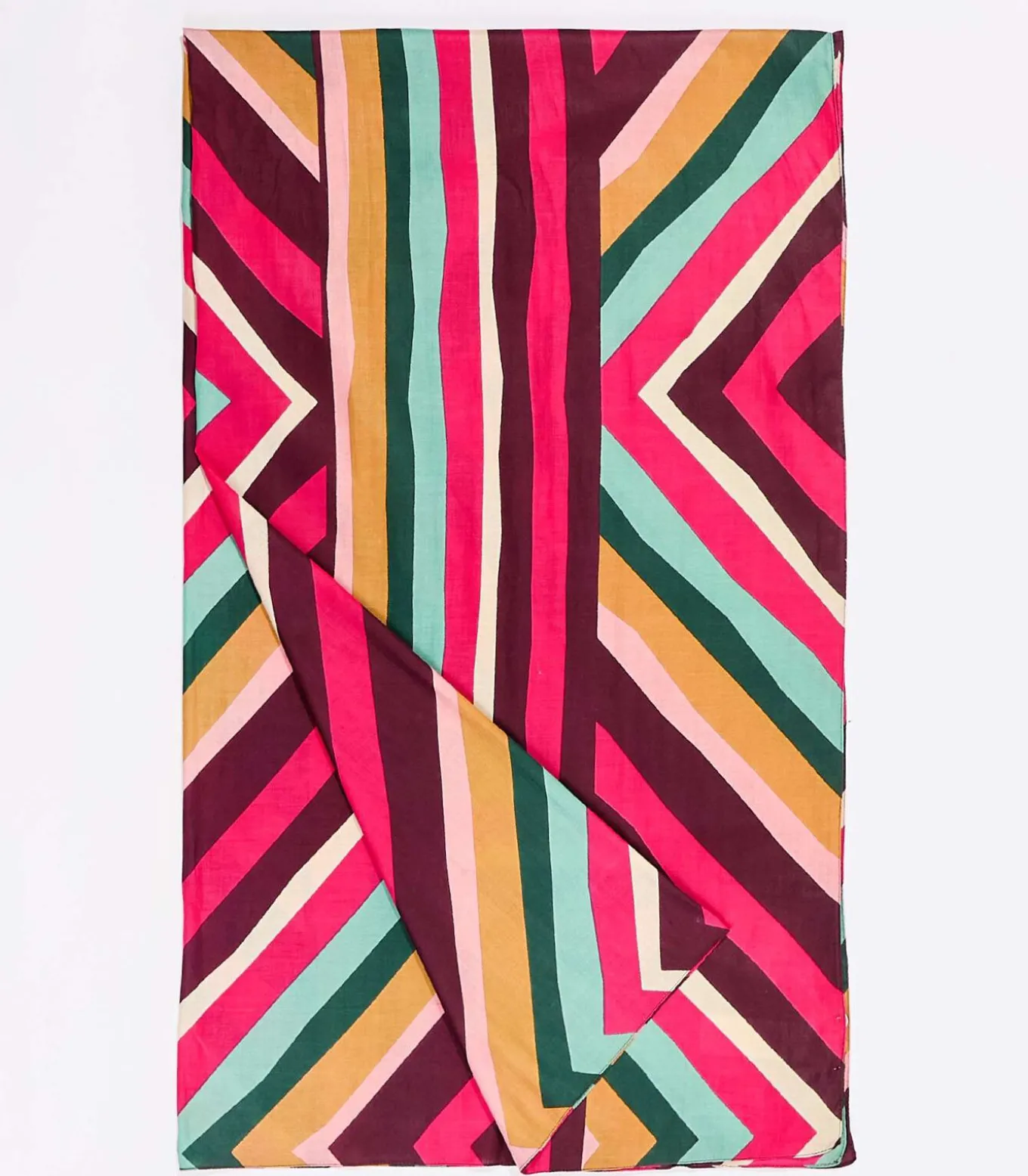 Grote rechthoekige bedrukte sjaal van 100% katoen met kleurrijke strepen, die uw outfits zowel casual als gekleed zal versterken. Zacht en licht, deze sjaal is perfect voor elk seizoen en biedt comfort en stijl bij elke gelegenheid. Productdetails: bedrukte katoenen sjaal, afmetingen: 180 x 100 cm.