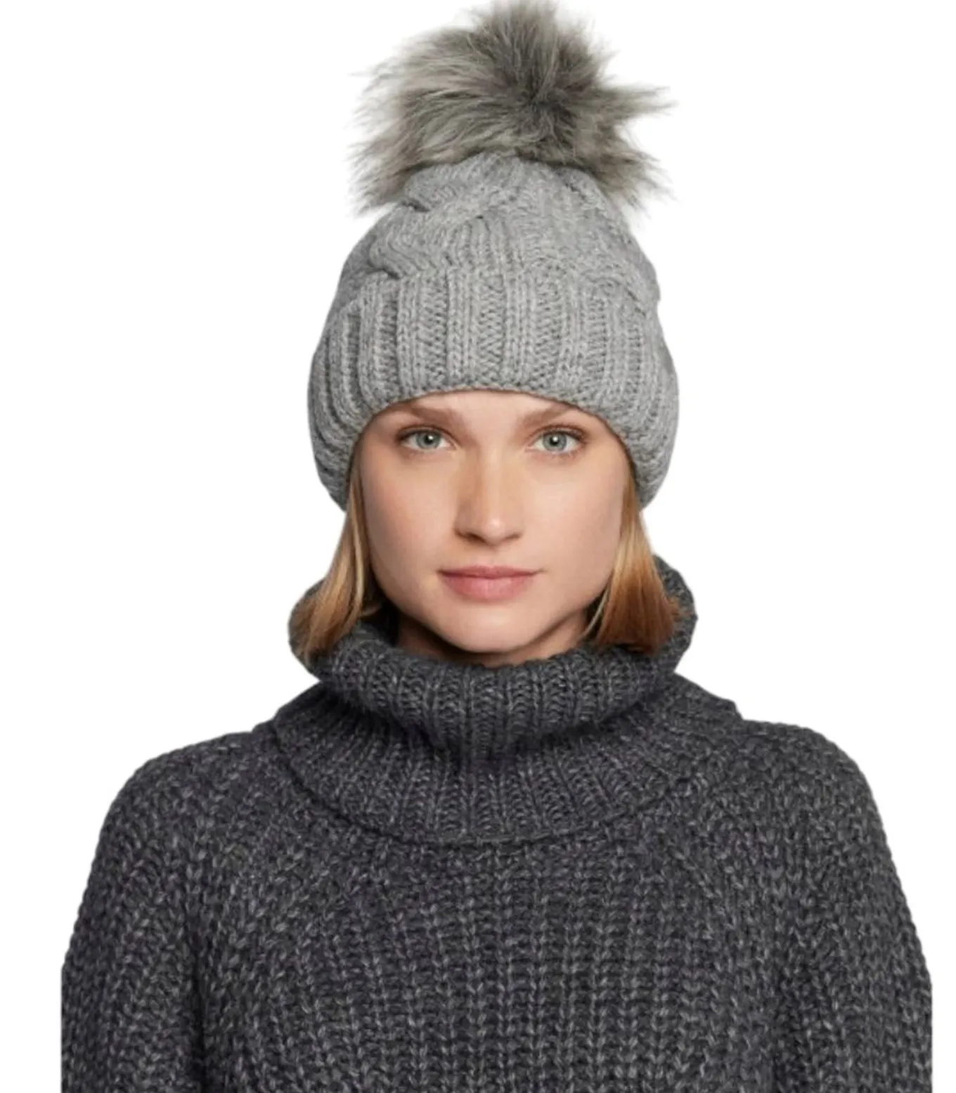 Kaphoed model 4F, H4Z22 CAD010 – Grijs van Muts. Deze kaphoed is gemaakt van 85% acryl en 15% polyamide. Het binnenvlak bestaat uit vleesveldeer en het ontwerp is kabelgebonden met een logo. Dit model is voorzien van een Faux Fur Pom Pom op de top en omgekeerde manchetten. De technologie voor de stof is licht en strekt zich uit.