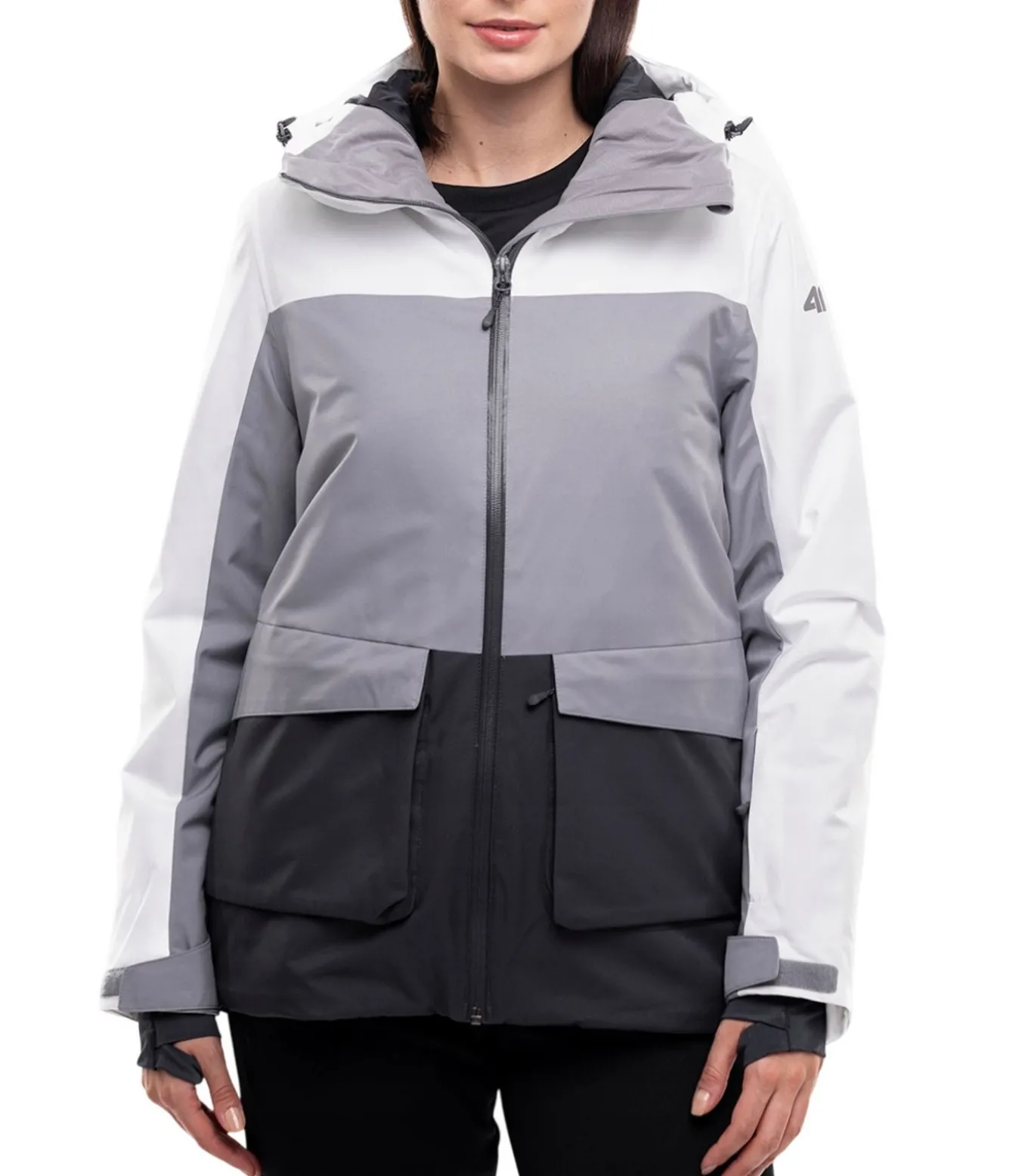 Het 4F, H4Z22 jasje is een zwarte jas met contrast en logo ontwerp. Deze jas is gemaakt van polyester stof, die ademend, waterdicht en voor vocht afvoer bedoeld is. De manchet is verstelbaar en heeft een treksluiting. De halslijn is een hoog halsband met kapitein. Het type mouw is met lange mouwen. Dit jasje heeft duimgaten en onbeperkte beweging. De kappen zijn aanpasbaar. Het jasje beschikt over 2 voorzakken met klepsluiting. De hele ritssluiting zorgt voor een stevige afsluiting. De maat is S: 36 in., L: 40 in. en XL: 42,5 in.