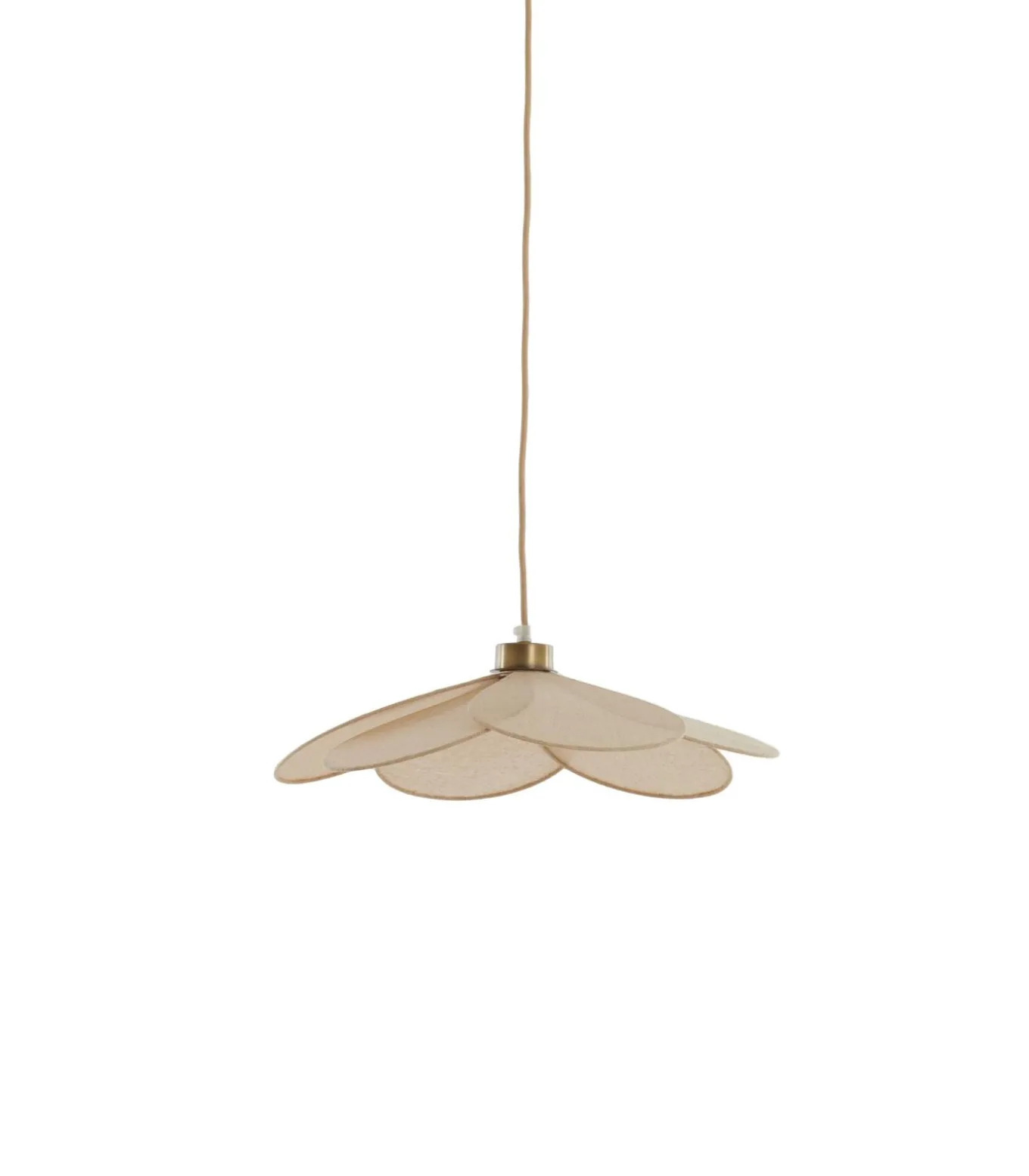 Fleur je interieur op met deze beige bloemenlamp. Deze bloemvormige hanglamp creëert sfeervol licht in de woonkamer, maar staat ook leuk in de kinderkamer. De vijf bladeren die samen een bloem vormen overlappen elkaar op speelse wijze. De beige stof is gespannen in een ijzeren frame waardoor de bloembladen stevig zijn. Deze plafondlamp past door zijn natuurlijke kleur en mooie ronde vormen in ieder interieur.