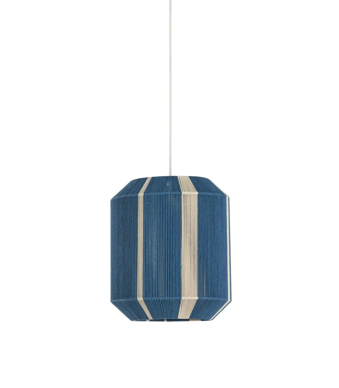 Deze hanglamp Kozana brengt warmte en sfeer in de woonkamer of eetkamer. De plafondlamp is voorzien van één lichtpunt met een lampenkap in verschillende blauwtinten die zacht, diffuus licht verspreidt. De lampenkap is gemaakt van draden die rond het frame gespannen zijn. De plafondbevestiging en de bovenkant van de lampenkap zijn gemaakt van ijzer. Dit combineert de stevigheid van metaal met de stoere uitstraling van de kap. Deze plafondlamp is niet alleen een praktische verlichtingsoplossing, maar ook een stijlvolle toevoeging aan je interieur.