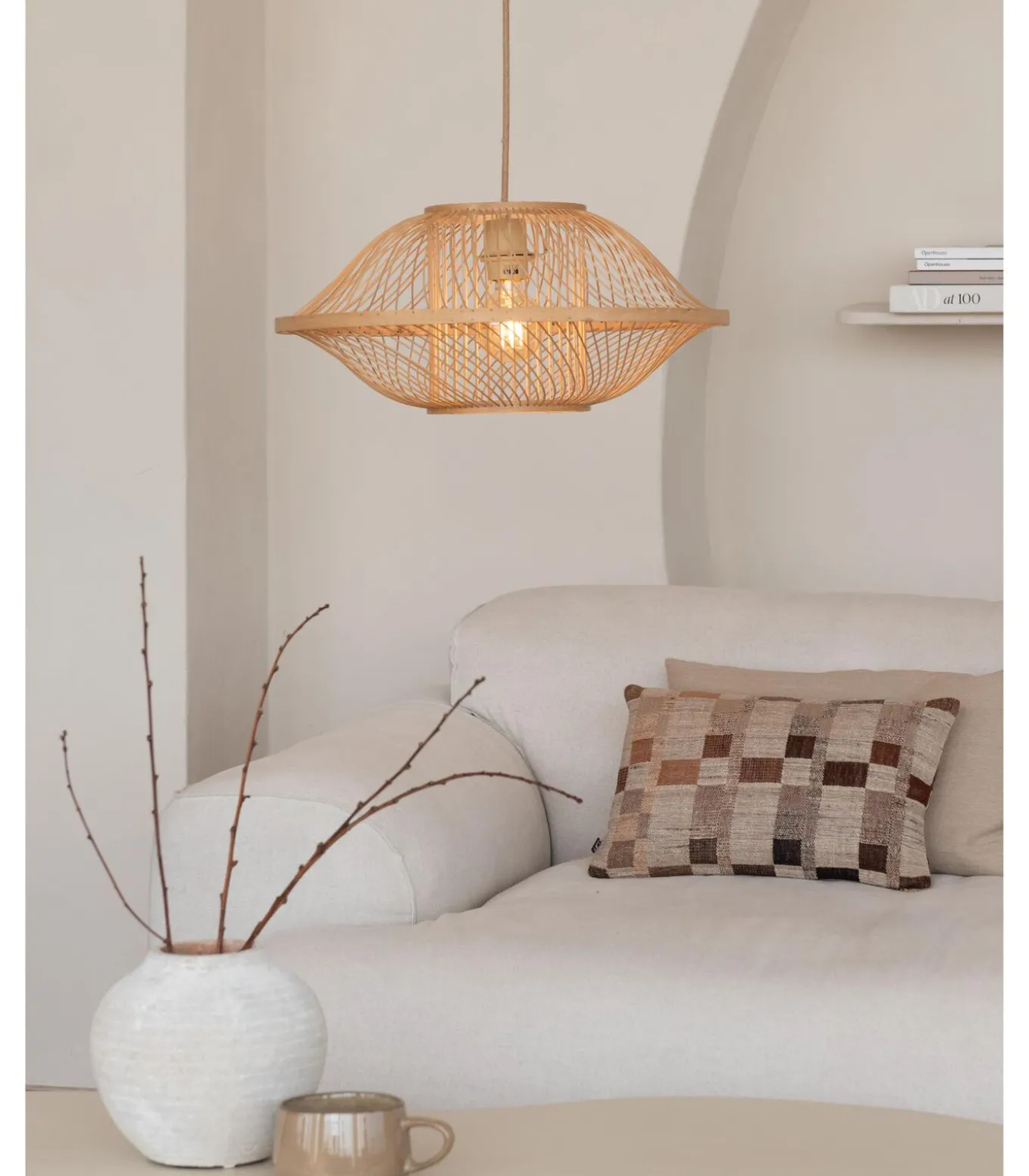 Hanglamp Maui naturel brengt de tropische charme van het eiland Maui in huis. Met zijn handgemaakte ontwerp van ronde bamboelatjes in een verfijnde spiegelstructuur, roept deze lamp de vloeiende kustlijnen en weelderige natuur van Maui op. De naturel kleur voegt warmte en diepte toe, terwijl het bamboe zorgt voor een authentieke uitstraling. Of de plafondlamp nu boven de eettafel hangt of een knus hoekje verlicht, hanglamp Maui straalt een onweerstaanbare mix van elegantie en tropische flair uit. Perfect om elke ruimte een stijlvolle, warme sfeer te geven. Eenvoudig te monteren met het bijgeleverde plafondsysteem.