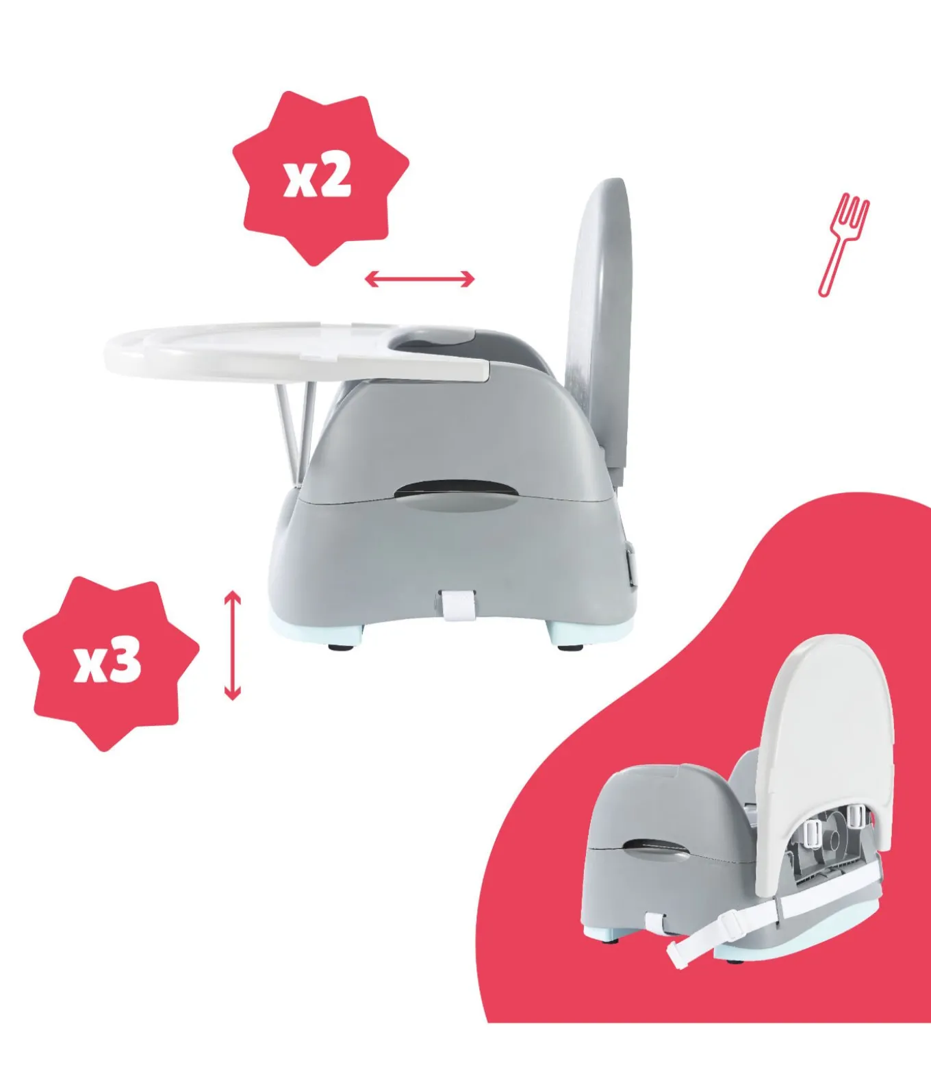 Past op elk type stoel Eenvoudig te installeren: 1 riem voor de zitting en 1 voor de rugleuning Ultracompact opvouwbaar voor optimale opslag (– 20 cm) Makkelijk mee te nemen met zijn schouderriem Eenvoudig in hoogte verstelbaar (3 standen van 10 tot 14 cm) Groot verstelbaar maaltijdplateau (2 posities), kan volledig worden verwijderd om de installatie te vergemakkelijken Slim opbergen van de tablet op de rugleuning van de stoel 3–punts veiligheidsgordel Schaalbaar, het verandert in een kleine fauteuil