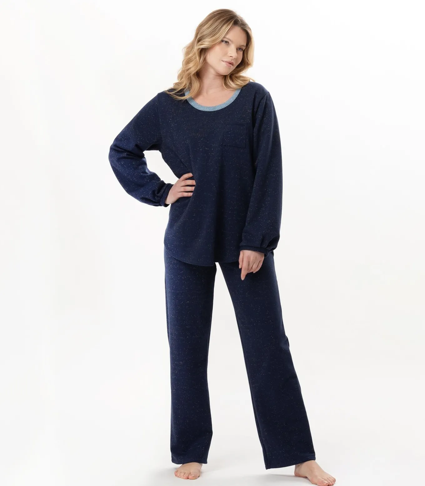 De op een sweatshirt geïnspireerde top en de rechte broek met elastische tailleband creëren een casual maar elegant silhouet voor al je dagelijkse momenten. De perfecte outfit voor op reis of om lekker thuis te zijn. Verkrijgbaar in twee kleuren: diep marineblauw of poederroze, beide voorzien van Lurex®–draden voor een glittereffect.Deze details maken het verschil: