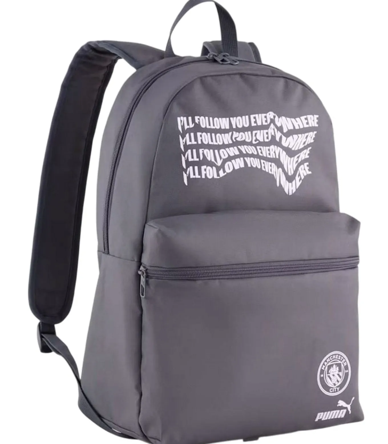 Puma’s I’LL FOLLOW YOU EVERYWHERE – Grijze Rugzak is gemaakt van 100% polyester en is officieel gelicentieerd. De rugzak heeft een hoofdcompartiment, verder een voorzak, rits, zijzak en gaaszak. Het ontwerp van de rugzak toont het Puma–crest, logo en tekst. De rugzak is gemaakt van hergebruikt materiaal en heeft gewatteerde, verstelbare schouderriemen, een gewatteerd rugpaneel met reflecterend detail en een draaghandvat van geweven band. De rugzak wordt vastgezet via een tweewegrits.