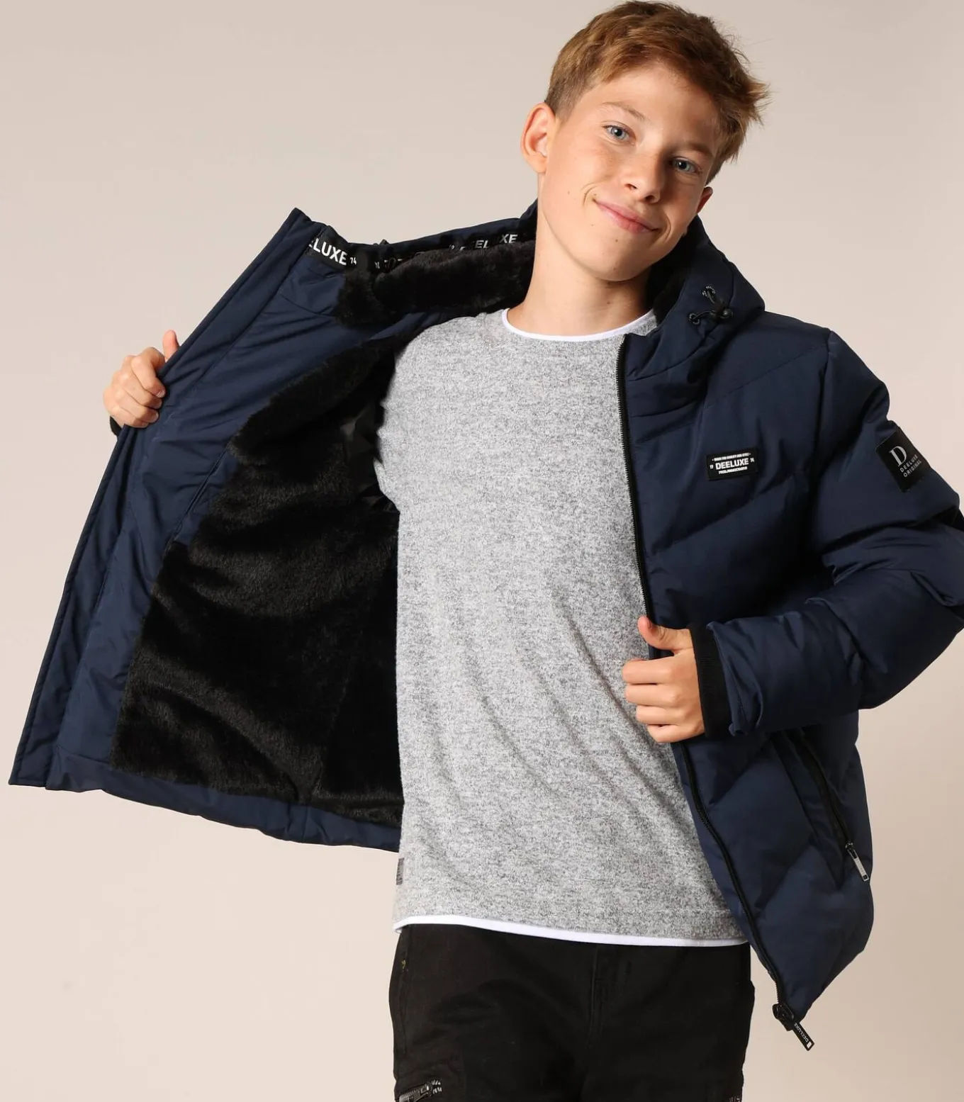 INTEREST jongens donsjack met een moderne, urban stijl. Dit rechte model heeft een horizontale stiknaad en een gladde textuur, perfect om koude dagen comfortabel door te komen. Het heeft een gewatteerde capuchon met trekkoorden, een contrasterende zwarte rits en twee zijzakken met rits. De logopatch is discreet op de borst aangebracht voor een grafische touch. Ontworpen voor het winterseizoen, combineert dit item warmte met eenvoud, ideaal voor dagelijks gebruik of in het weekend.