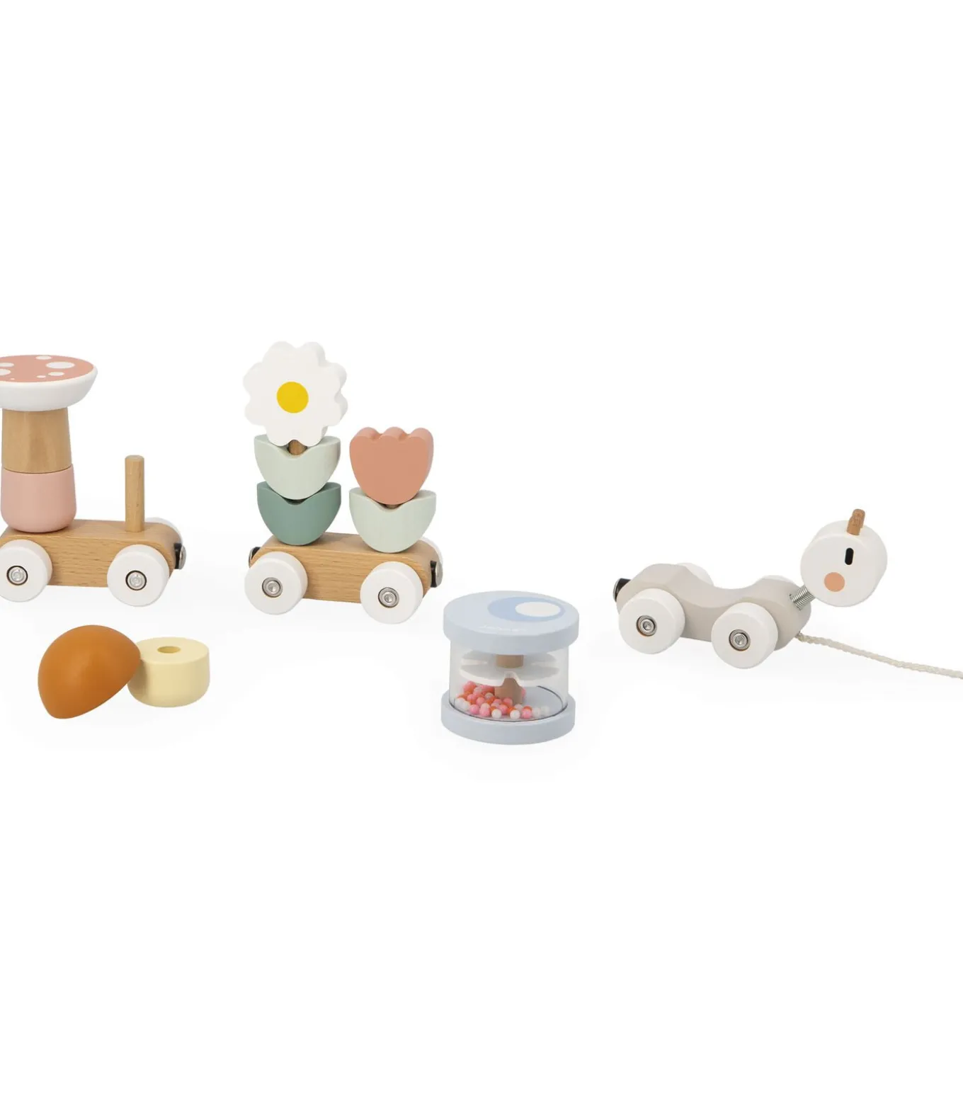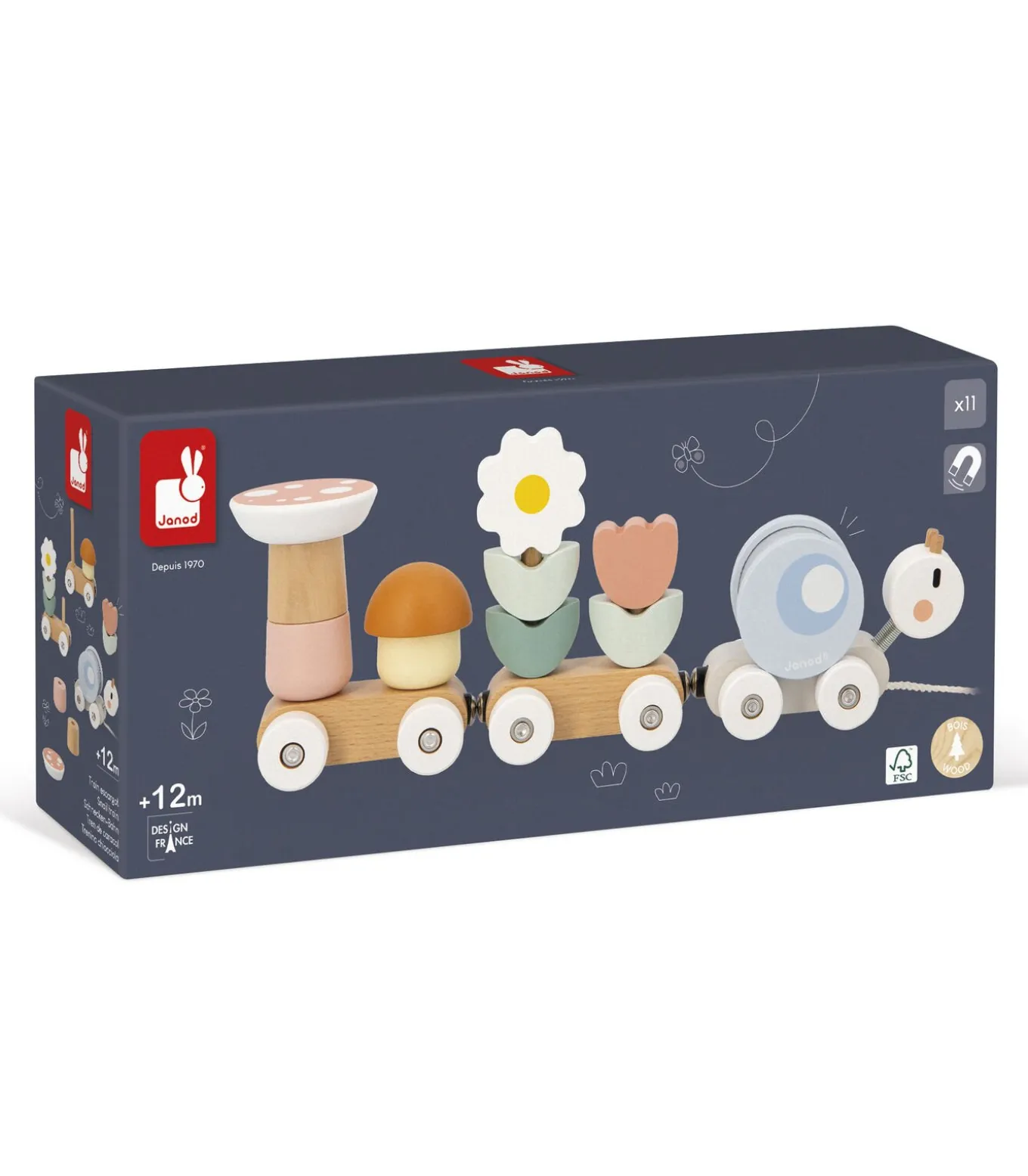 Janod houten speelgoed – Sweet Cocoon Slakkentrein – educatief trek– en bouwspeelgoedMet de houten slakkentrein van Janod wordt spelen een vrolijk avontuur! Dit kleurrijke speelgoed stimuleert de motoriek van je kleintje en laat hem of haar op speelse wijze vormen en kleuren ontdekken. De slakkentrein bestaat uit drie magnetische wagons en tien stapelbare onderdelen, waaronder bloemen, paddenstoelen en een vrolijke knikkerrammelaar als slakkenhuis. De verschillende vormen en kleuren prikkelen de zintuigen en zorgen voor uren speelplezier. Dankzij het stevige FSC–hout en het handige trekkoord kan je kindje de trein overal mee naartoe nemen. De slakkentrein groeit mee met je kind: eerst bouwen en ontdekken, daarna lekker wandelen en trekken!Extra informatieStimuleert motoriek en zintuigenGemaakt van duurzaam FSC–houtInclusief knikkerrammelaar en trekkoordGeschikt vanaf 1 jaar