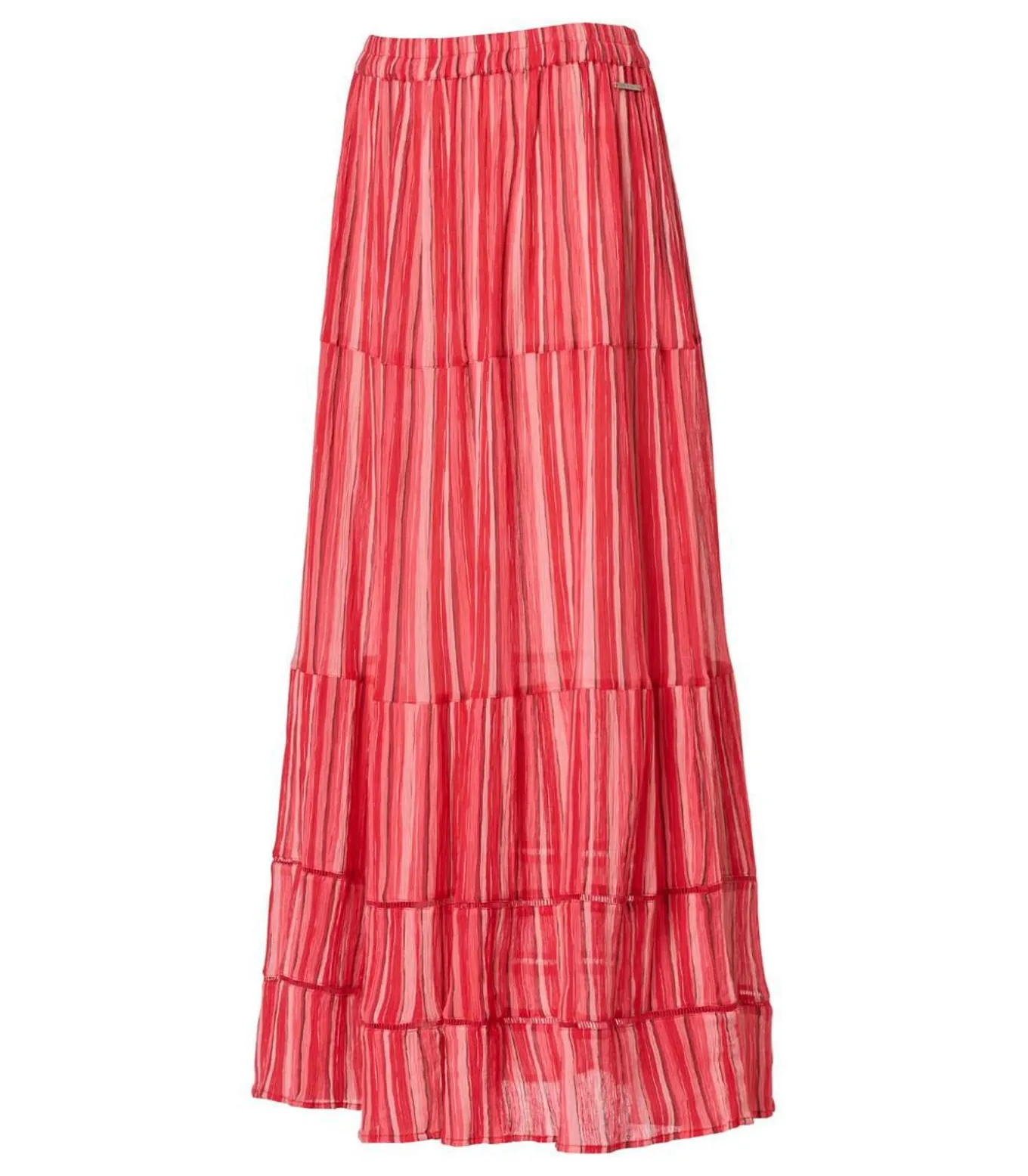 De Jody rok is een stijlvolle en verfijnde toevoeging aan je garderobe. Deze lange, zwierige rok is vervaardigd uit crinkle voile en heeft een elegant gestreept patroon. De pasvorm sluit mooi aan rond de taille en heupen, waarna de rok wijd uitloopt tot aan de enkels voor een vloeiend en flatterend silhouet. Dankzij het tijdloze design is deze rok perfect voor zowel formele als informele gelegenheden, zoals een werkdag of een gezellige avond uit. De Jody rok behoort tot dezelfde collectie als de Eli print blouse, waardoor je een prachtige, gecoördineerde look kunt creëren die zowel comfortabel als elegant is. De rok is veelzijdig en eenvoudig te combineren met diverse tops en accessoires. Voor een casual uitstraling combineer je hem met sandalen en een luchtige blouse, terwijl een elegante top en hakken zorgen voor een meer verfijnde en formele look. De klassieke strepen en zachte kleuren maken het mogelijk om eindeloos te variëren met verschillende combinaties.