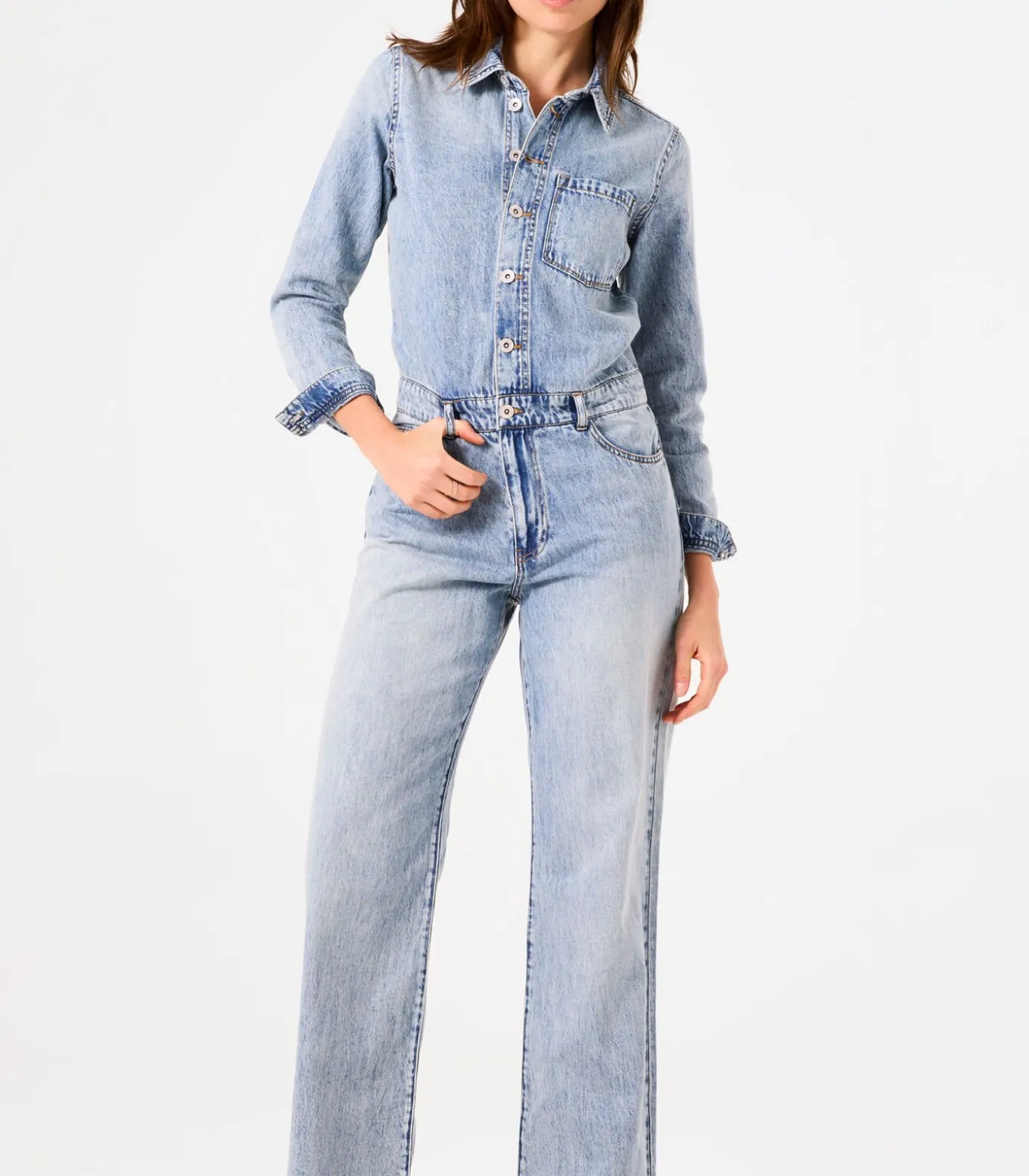 Jumpsuit met denimlook. Ideaal voor een all denim look! Deze jumpsuit heeft een knoopsluiting, een borstzak en een regular fit. Dit item is gemaakt van 100% katoen.Better Cotton is een initiatief dat zich wereldwijd inzet voor betere omstandigheden in de katoenindustrie.