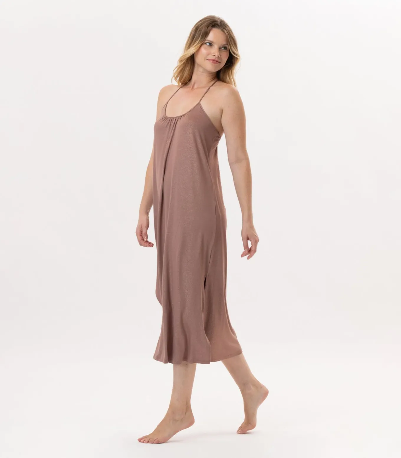 Hoe draag je de RAMATUELLE 941 lange jurk met gekruiste rug in glanzende bedrukte jerseyDe dunne bandjes onthullen een verstelbaar rugloos ontwerp met trekkoorden, waarmee u de snit kunt personaliseren, terwijl de zijsplitten een vleugje soepelheid toevoegen.