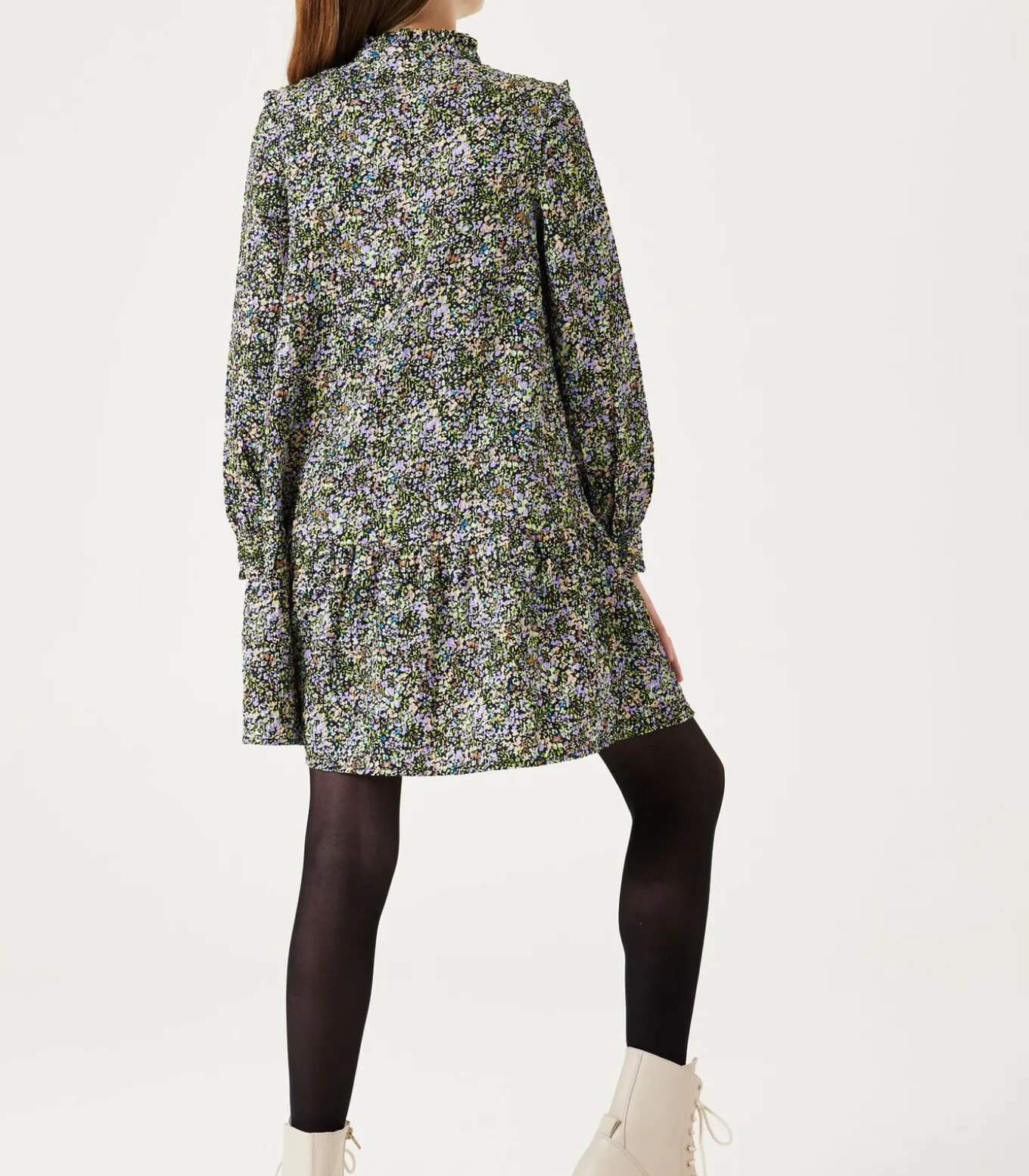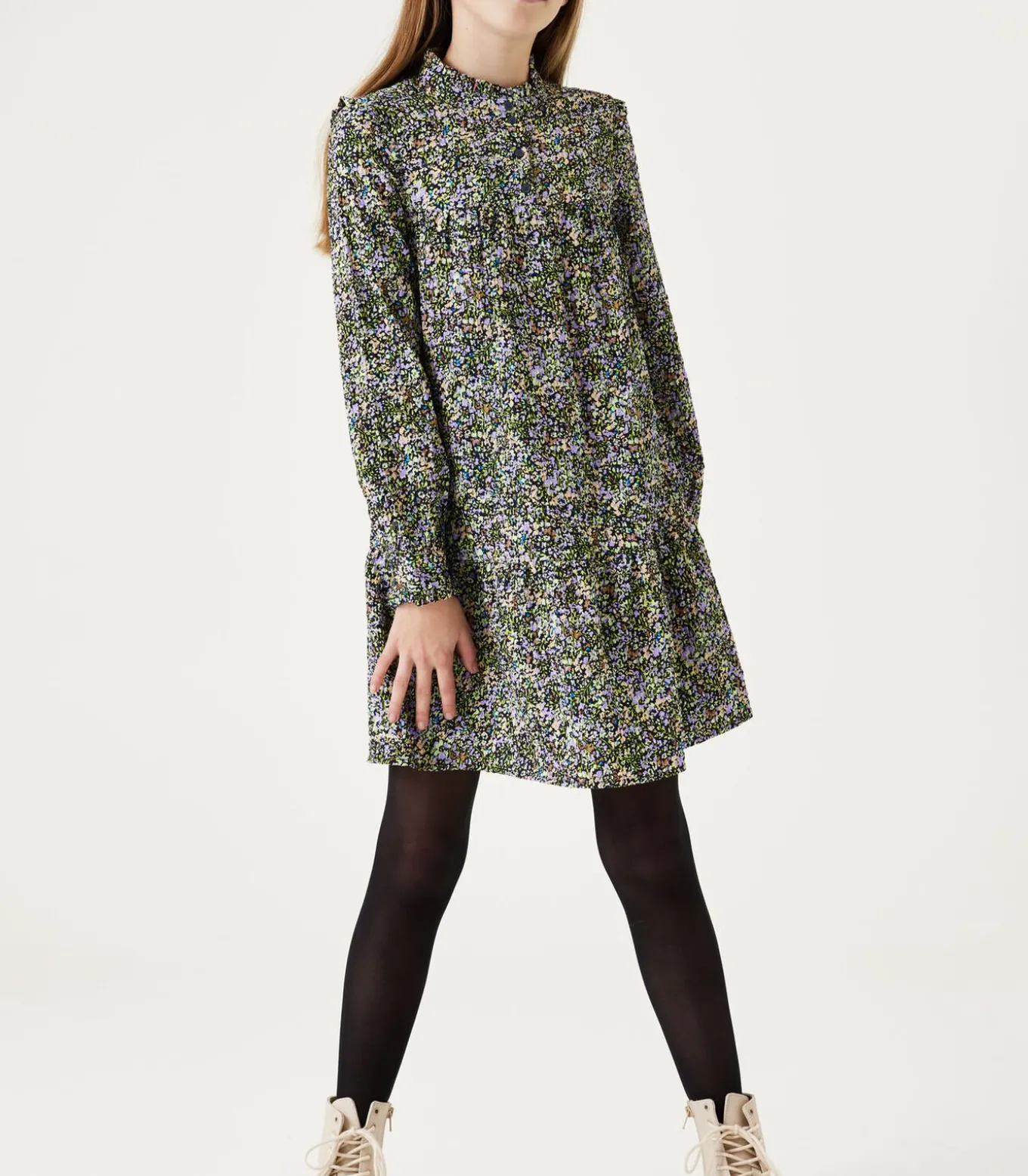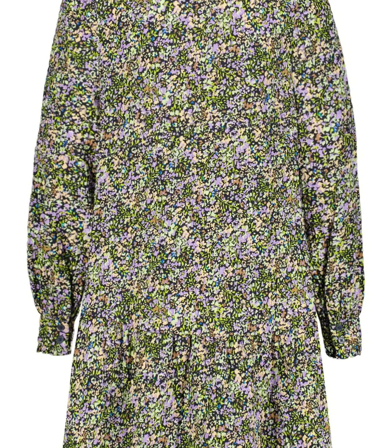 Jurk met allover print. De jurk heeft een opstaand kraagje met knoopjes, ruffles en een wide fit. Dit item is gemaakt van 98% recycled polyester en 2% elastaan.