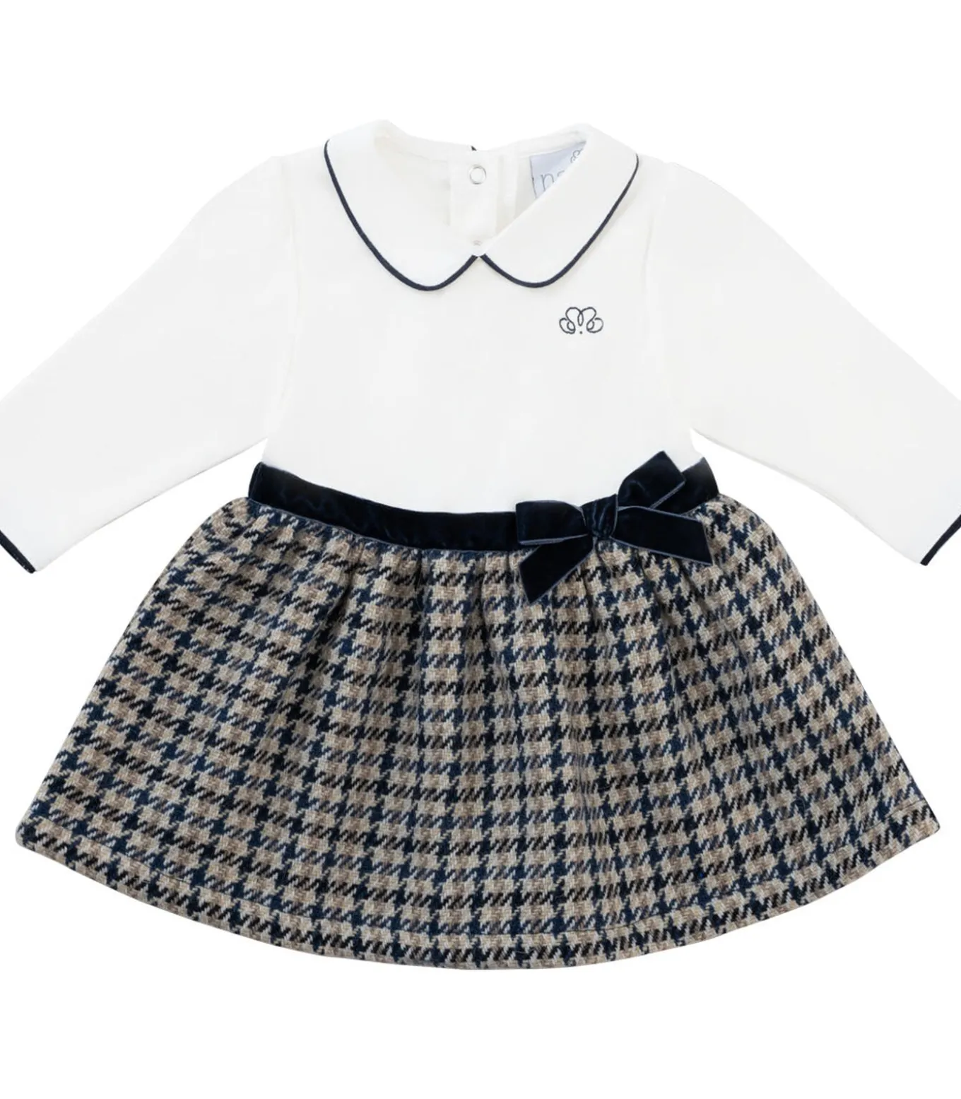 Wit kleedje met beige/ blauwe vichy. De mouwen en het kraagje zijn afgewerkt met een donkerblauw boordje. Het kleedje heeft langs de achterzijde drukknopen.