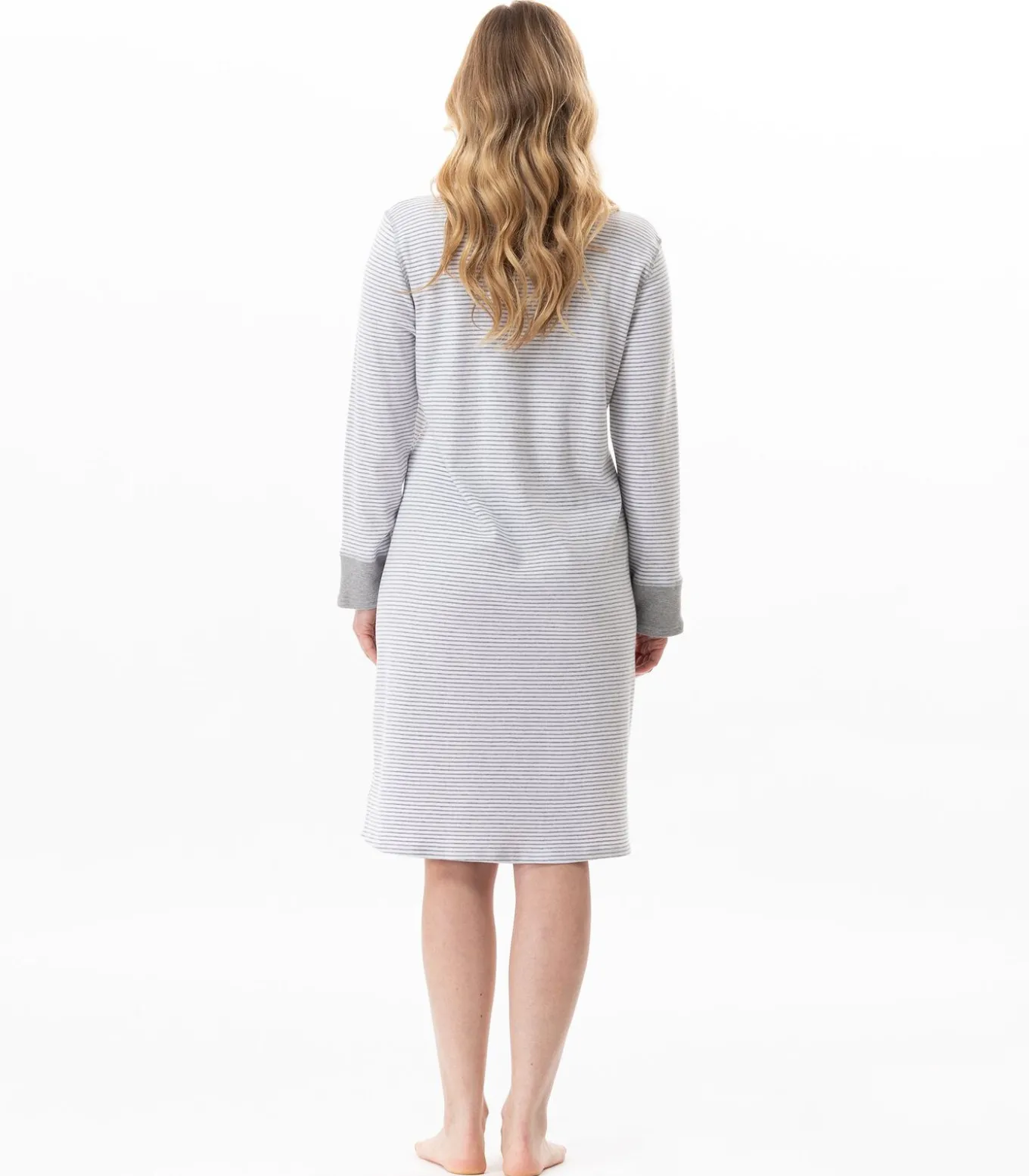 De milleraies–strepen op een gebreide trui zo zacht als een sneeuwvlok en de vloeiende snit: alles wat je nodig hebt om dit een comfortabele essential voor de nacht te maken.