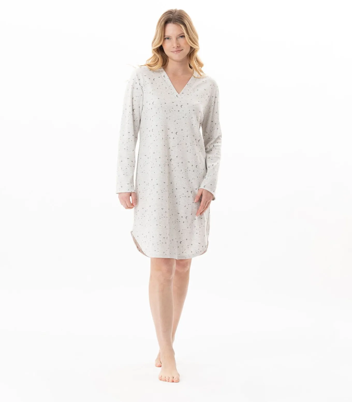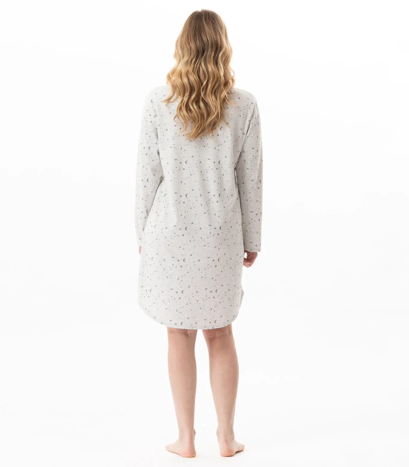 Het valt op door de zorgvuldige afwerking en de sterrenbeeldprint van de Grote Beer, die een dromerige touch toevoegt aan vredige nachten. Het Luna nachthemd is verkrijgbaar in twee uitvoeringen: gouden print op een ecru achtergrond of donkergrijs op heidegrijs. Maak je nachtkleding compleet met een kamerjas, badjas of Essential jas om je ’s nachts warm te houden. Kom gewoon uit bed.
