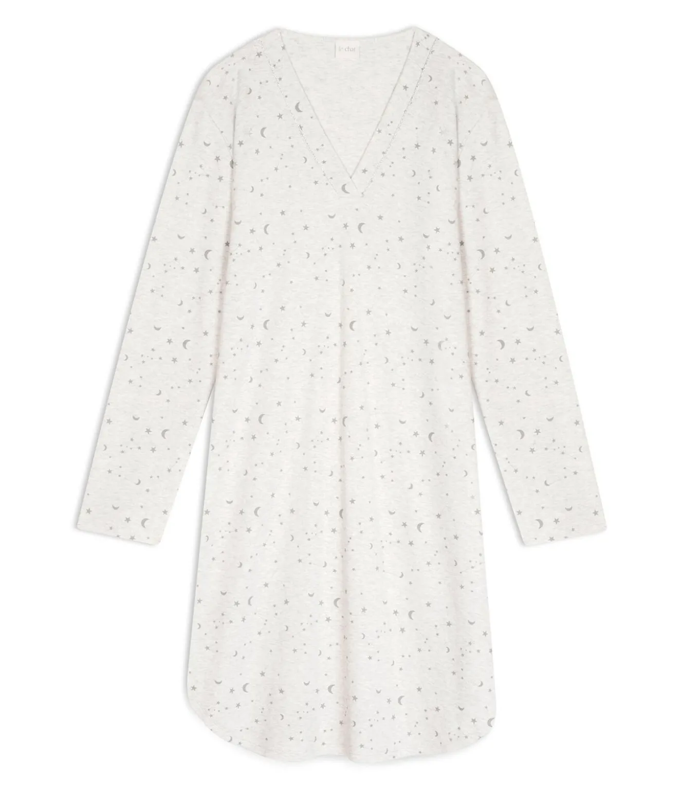 – V–hals met brede randen, geaccentueerd door een discrete Lurex–bies, die een vleugje vrouwelijkheid toevoegt aan de nachtjapon.