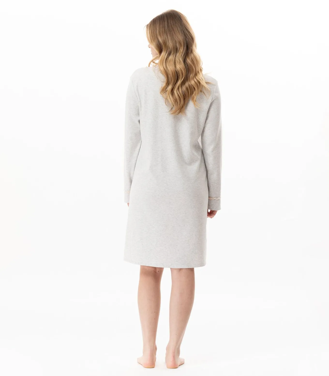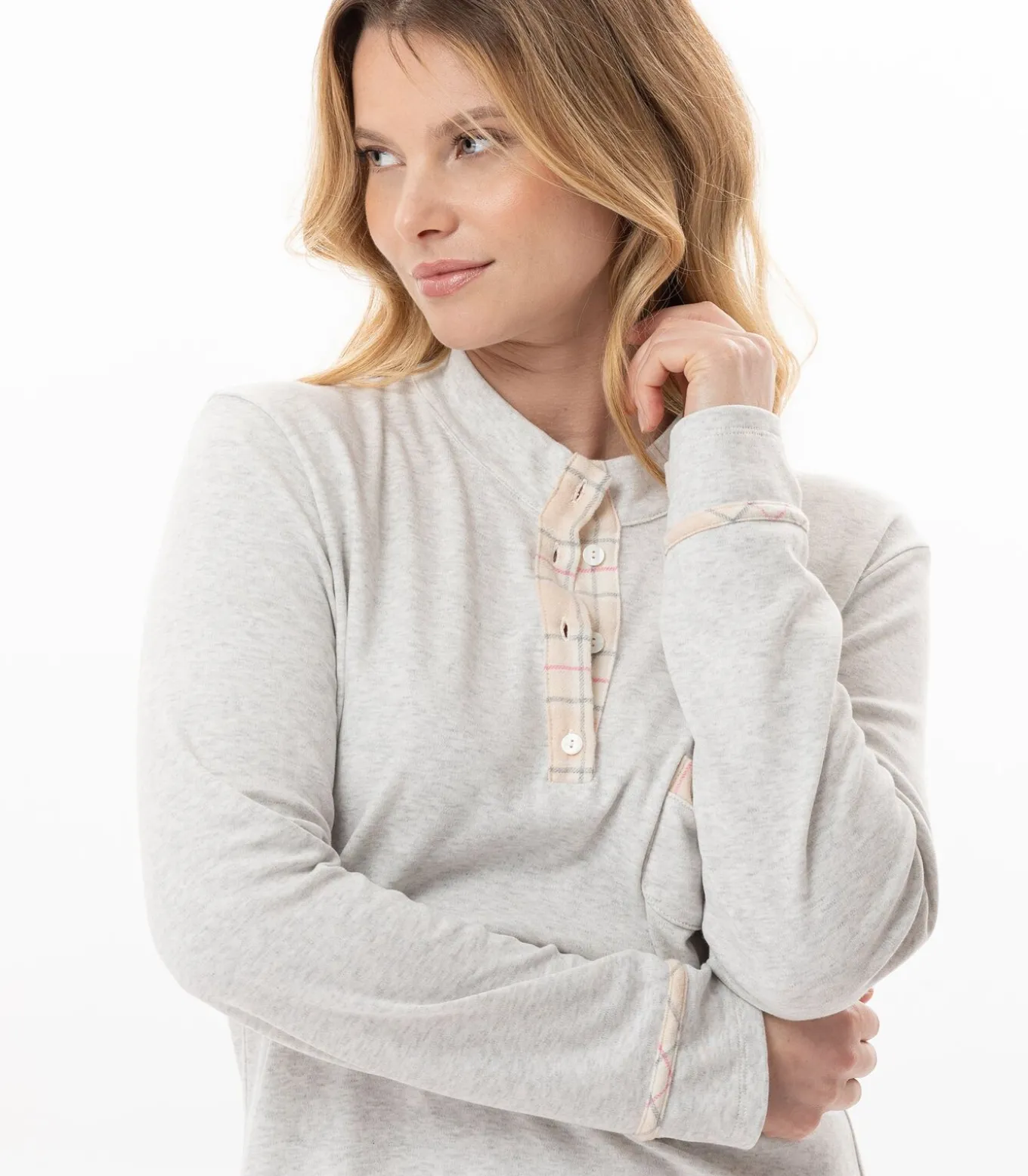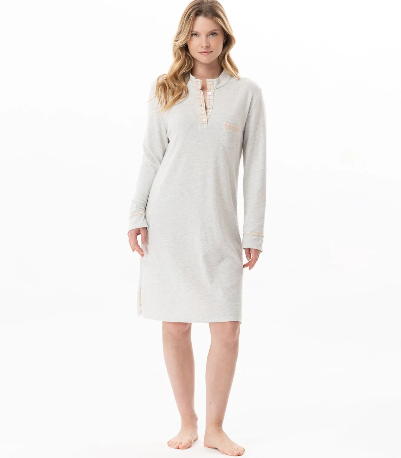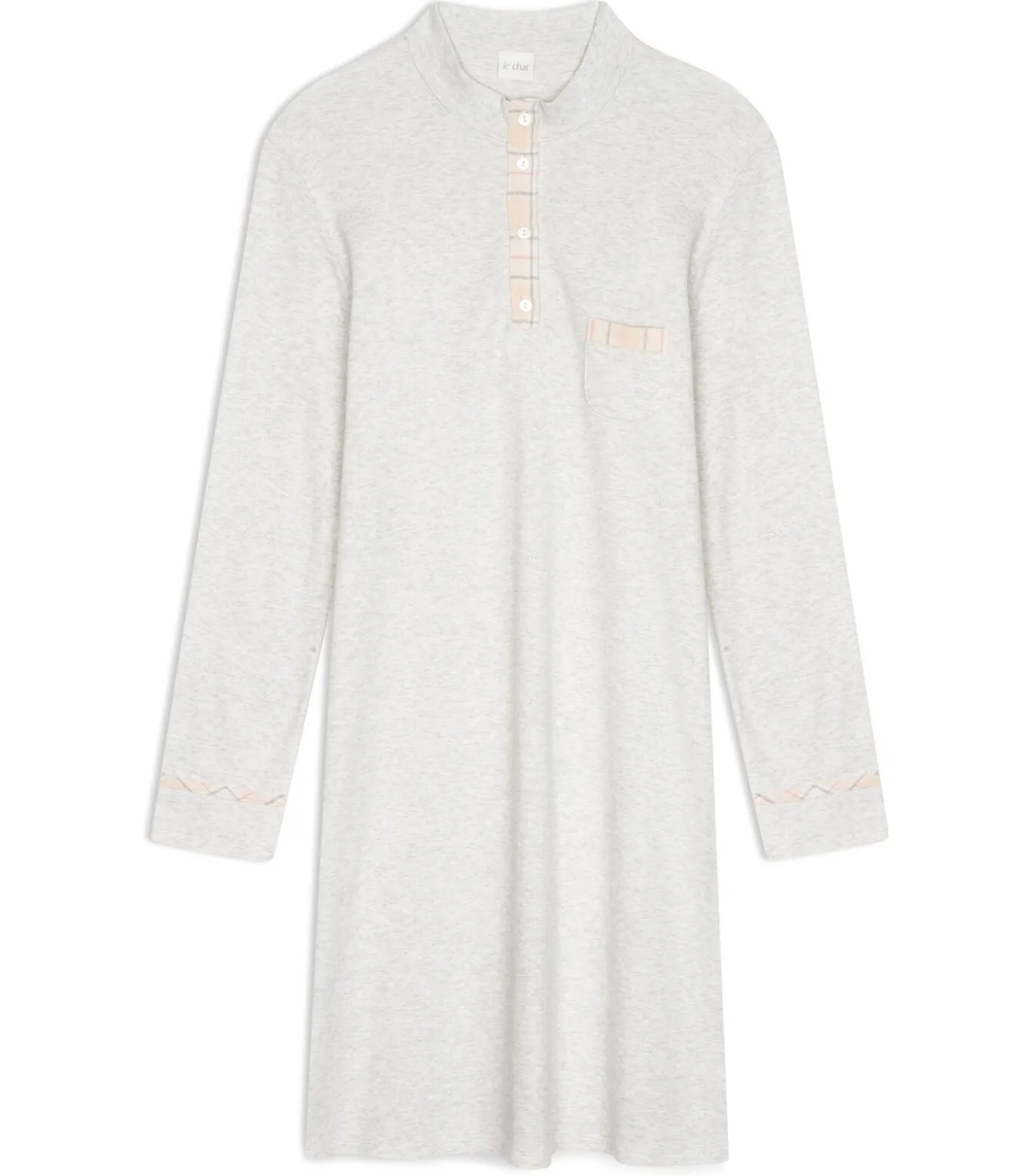Hij valt op door zijn mooie tartandetails en zijn kleine officierskraagje, dat naast een zachte warmte rond de nek ook een modieuze touch geeft aan dit essentiële nachthemd.