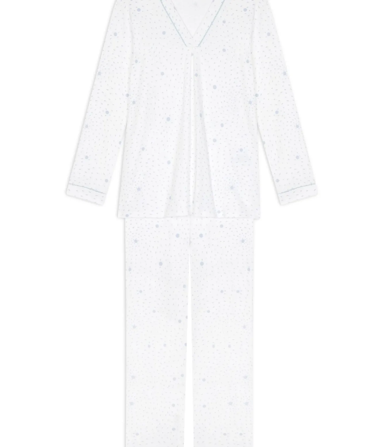 Hij valt op door zijn zorgvuldige afwerking en delicate print, verkrijgbaar in twee uitvoeringen: grijs op een lichtroze achtergrond of hemelsblauw op een ecru achtergrond. Maak je nachtkleding compleet met het Club–jasje of het Kelly–jasje, een kamerjas, een badjas of een Essentiel–jasje om je warm te houden als je uit bed stapt.