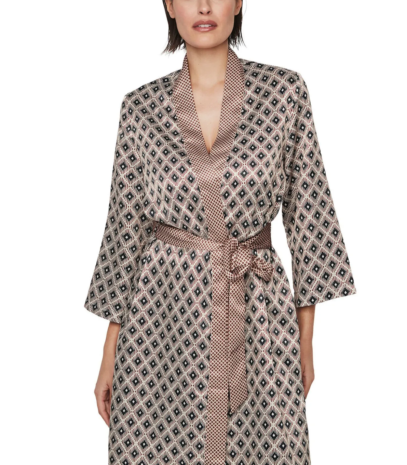 Een kimono met driekwart mouwen en een geraffineerd, elegant dessin in een satijnen stof die ultrazacht en vloeiend aanvoelt op de huid, wat zorgt voor een luxueuze uitstraling. De stof is versierd met een ruitpatroon, waardoor een zeer chique grafisch effect ontstaat. De V–halslijn en boorden en tailleband contrasteren met de rest van het kledingstuk in een rozebruine tint met een wit geometrisch rasterpatroon, wat textuur en een interessant contrastspel toevoegt. Het kan worden vastgemaakt met een bandje die in de taille kan worden geknoopt, zodat de pasvorm kan worden aangepast aan het silhouet. Een serie die zowel het comfort van een loungepak oproept als de elegantie van een gekleed, stijlvol kledingstuk voor een verfijnde interieurlook.