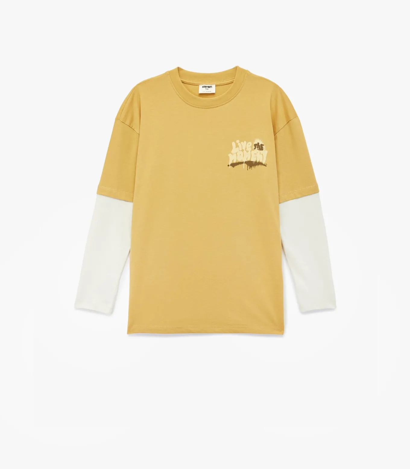 Dit comfortabele en moderne T–shirt is perfect voor de dagelijkse kleding van kinderen. Het shirt heeft lange mouwen en een ronde hals, wat een sportieve uitstraling geeft. Het printdetail voegt een energieke look toe. Gemaakt van zacht katoen voor comfort, geschikt voor elk seizoen.