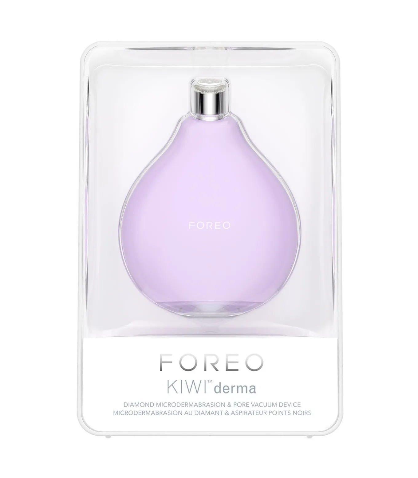EEN DECENNIUM JONGER MET TRIPLE–TECH SKIN RESURFACINGVan dichtbij is je gezicht een fascinerend terrein van ongelijkmatige, interessante, door elkaar lopende snelwegen van haren, lijntjes, plooien, zonneschade, ouderdomsvlekken, verkleuringen, sproeten, 20.000 poriën die constant verstopt raken en droge plekken met dode huidcellen. Het is een veelgebruikt oppervlak dat iedere minuut van de dag wordt blootgesteld aan diverse elementen en jouw nonchalance tolereert op het gebied van zonnebescherming, hydratatie, voldoende water drinken en de onvermijdelijke tijd.KIWI™ derma van FOREO is ontworpen voor iedereen die in een paar minuten een decennium van zijn gezicht wil halen. Het combineert meerdere technologieën en bouwt voort op een bekroond design. Het poriën reinigende– en microdermabrasie apparaat is gemaakt van alleen de beste, duurzame en ultra–hygiënische materialen en is voorzien van Adamas–diamanten. Poriën zijn essentieel om ons natuurlijk verzachtende en beschermende talg over de huid te verspreiden, maar mee–eters en ontstekingen willen we graag vanaf. Onze huidcellen moeten sterk, krachtig en jong blijven, maar doordat ze zich vernieuwen en zich opstapelen ziet onze huid er ouder en vermoeider uit dan nodig. De zon op onze huid is essentieel, maar onvoldoende bescherming en overmatige blootstelling leiden tot vroegtijdige huidveroudering, pigmentvlekken en ongelijkmatige structuur van de huid. We houden van herinneringen die ons laten lachen, maar de aangetaste huidstructuur zal uiteindelijk fijne lijntjes en rimpels gaan vertonen. De 3 Adamas diamanten microdermabrasie puntjes exfoliëren de doffe, beschadigde laag van dode huidcellen om de frisse en stralende huid eronder te onthullen. Stimuleer een gezonde celvernieuwing, bevorder de absorptie van huidverzorgingsproducten, verminder littekens en pigmentvlekken en vervaag tekenen van huidveroudering. Microdermabrasie in combinatie met een perfect gekalibreerd vacuüm zuigt de viezigheid uit verstopte poriën, waardoor ze perfect gezuiverd en minder zichtbaar worden. T–Sonic™ massage helpt pigmentatie te vervagen en wallen te verminderen, verstevigt de huid en laat deze stralen, stimuleert de bloedsomloop en lymfedrainage, stimuleert de collageenproductie en het natuurlijke genezingsproces van de huid.KIWI™ derma verjongt de huid, herstelt de huidtextuur effectief, maakt deze gladder en egaler, egaliseert de huidtextuur en –toon en vermindert fijne lijntjes, rimpels en hyperpigmentatie, terwijl onzuiverheden zachtjes diep uit de poriën worden gehaald om ze te zuiveren voor die egale look.