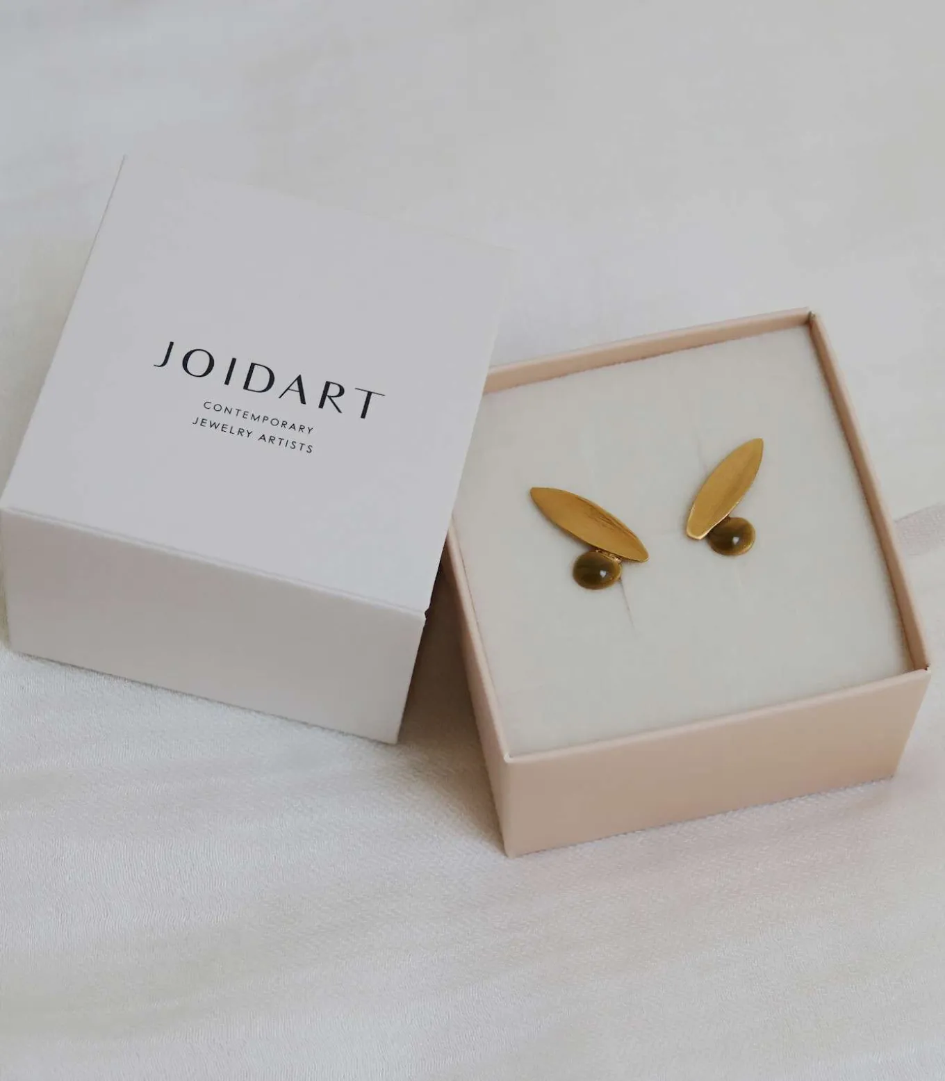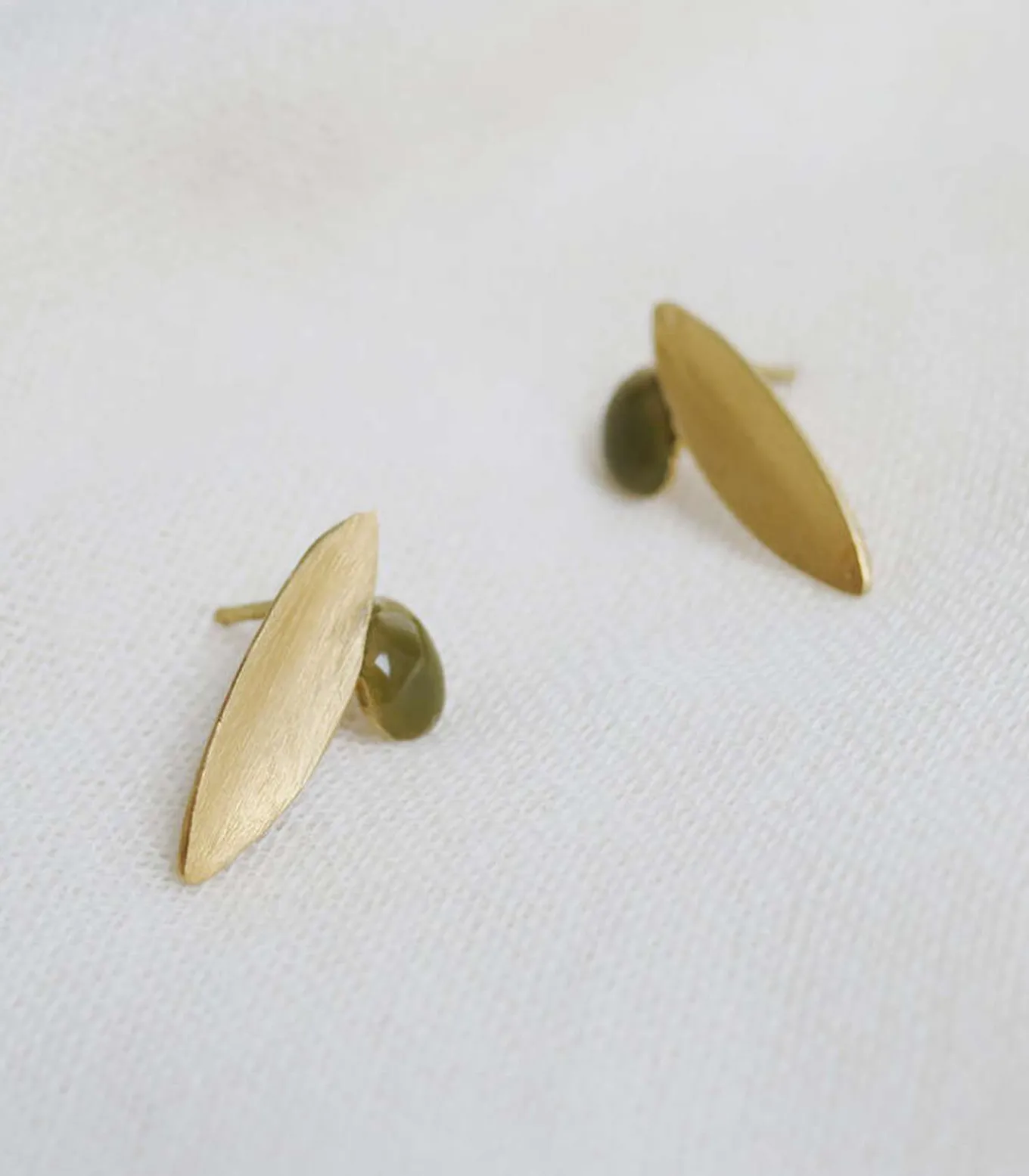 Kleine oorbellen met vlindersluiting, bestaande uit een metalen plaatje en een olijfgroen geëmailleerd bolletje. Verguld met 24–karaats goud.