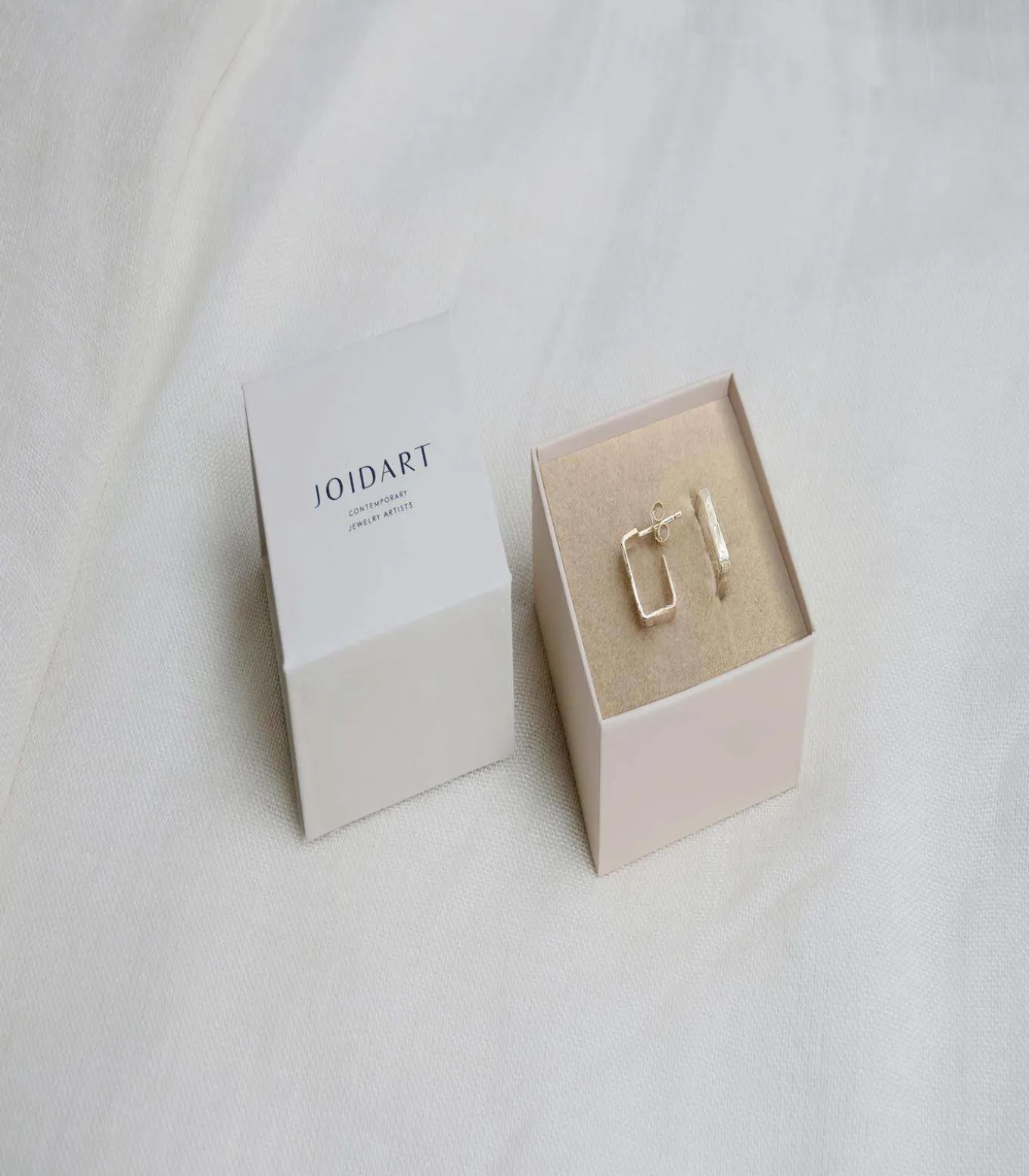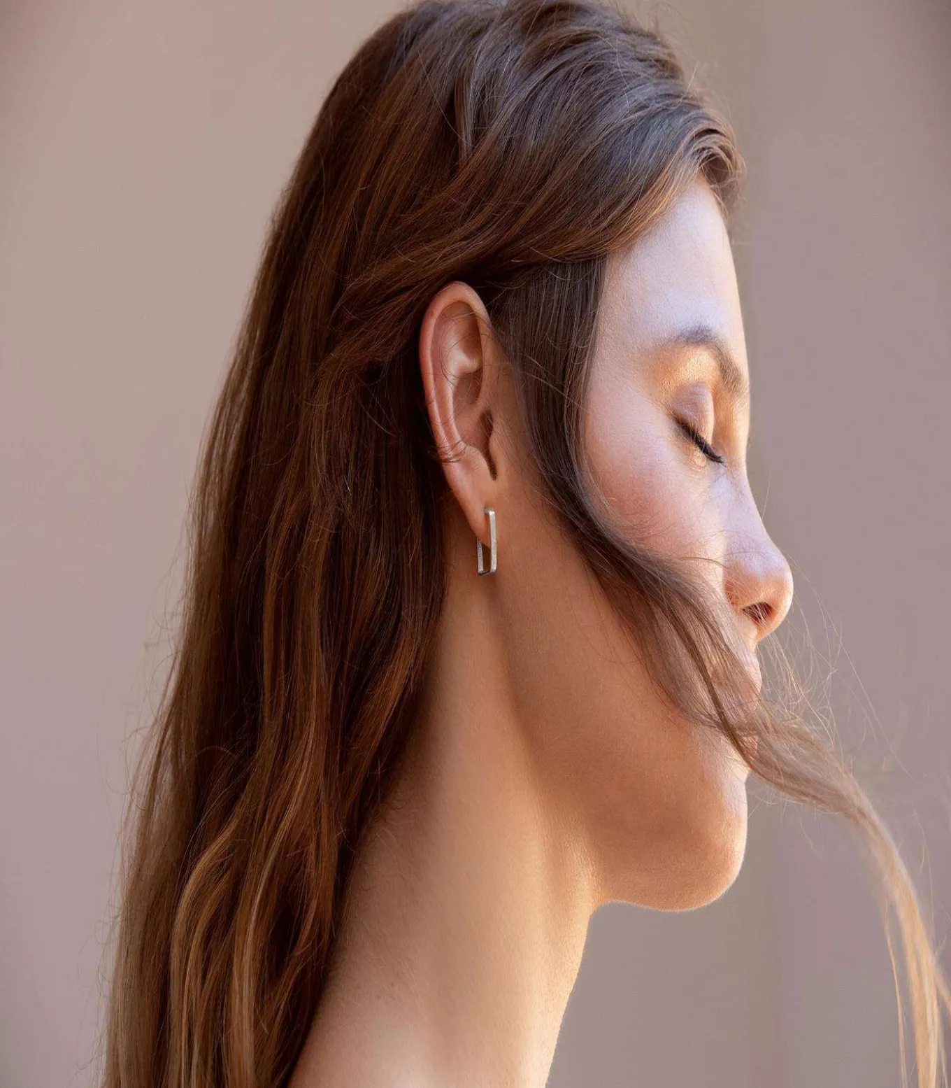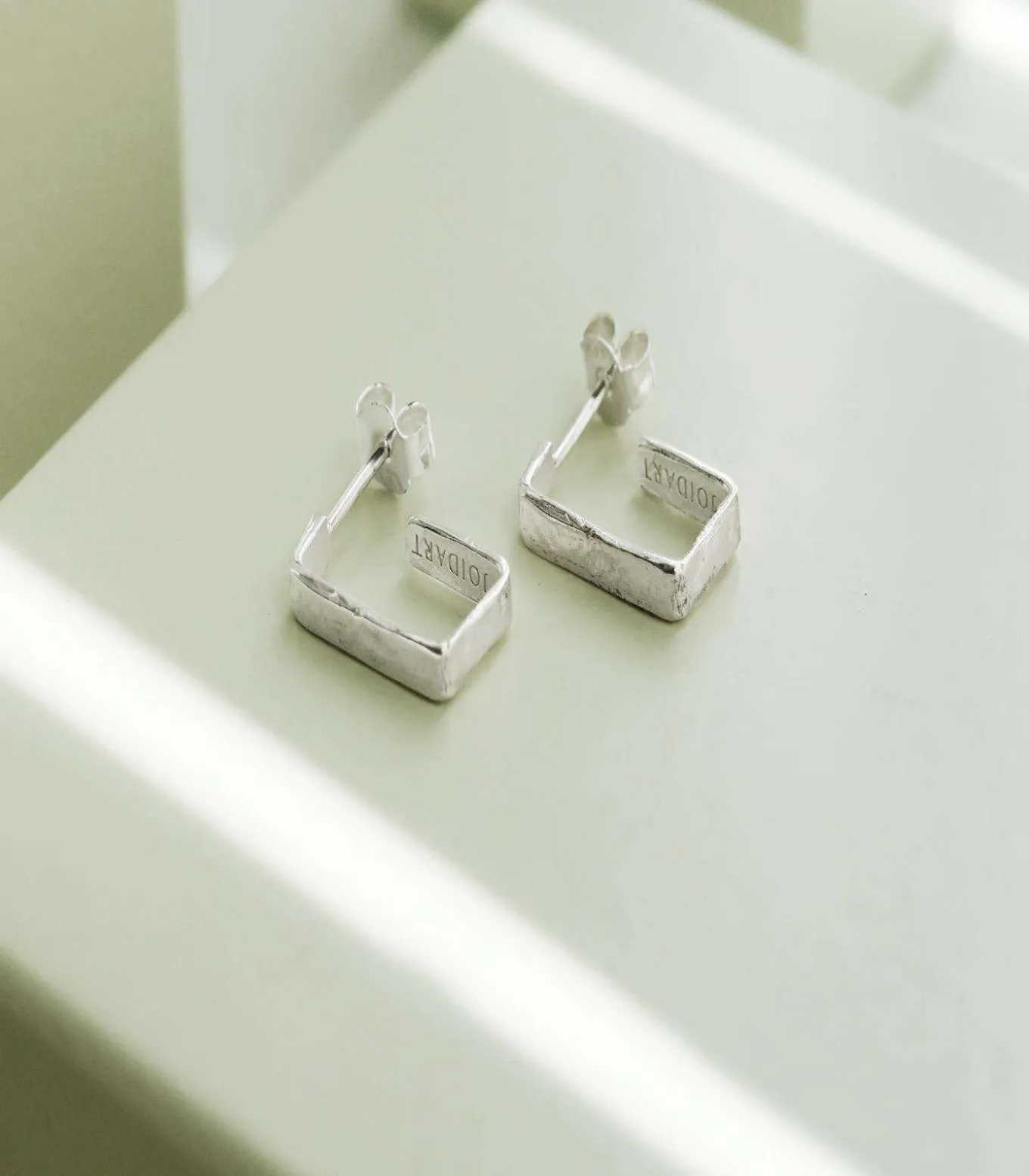 Kleine, rechthoekige oorbellen van mat glanzend 925 zilver met een platina coating. Smal ontwerp met texturen die doen denken aan de schors van sommige mediterrane bomen. Vlindersluiting.