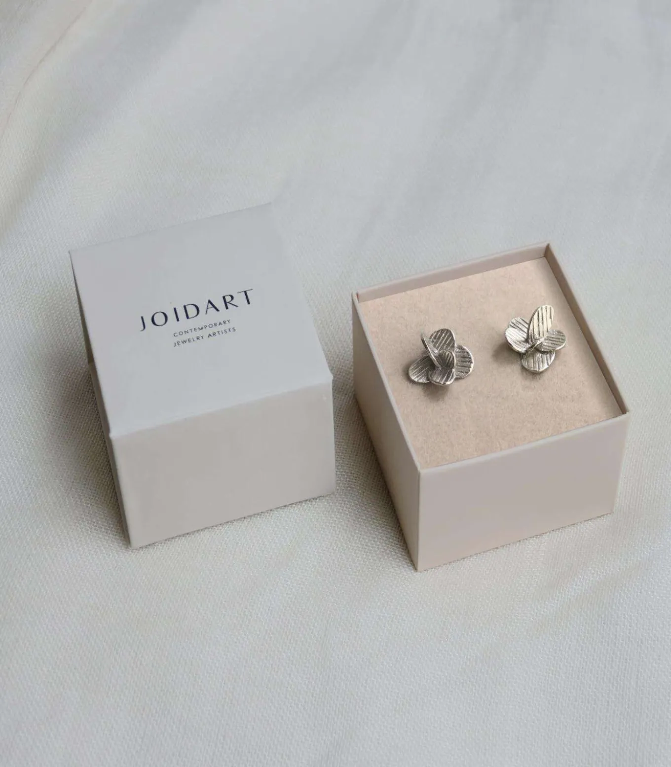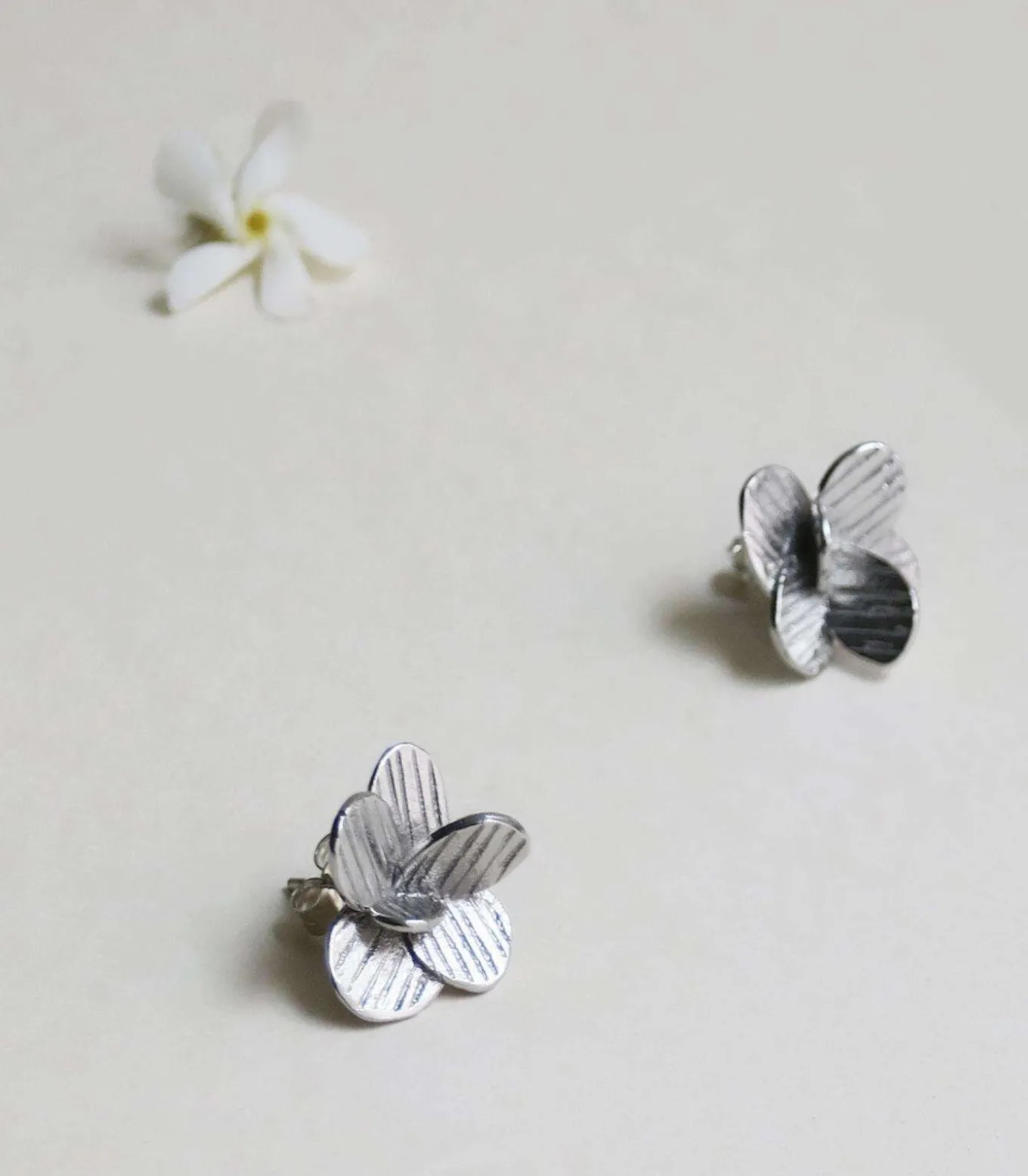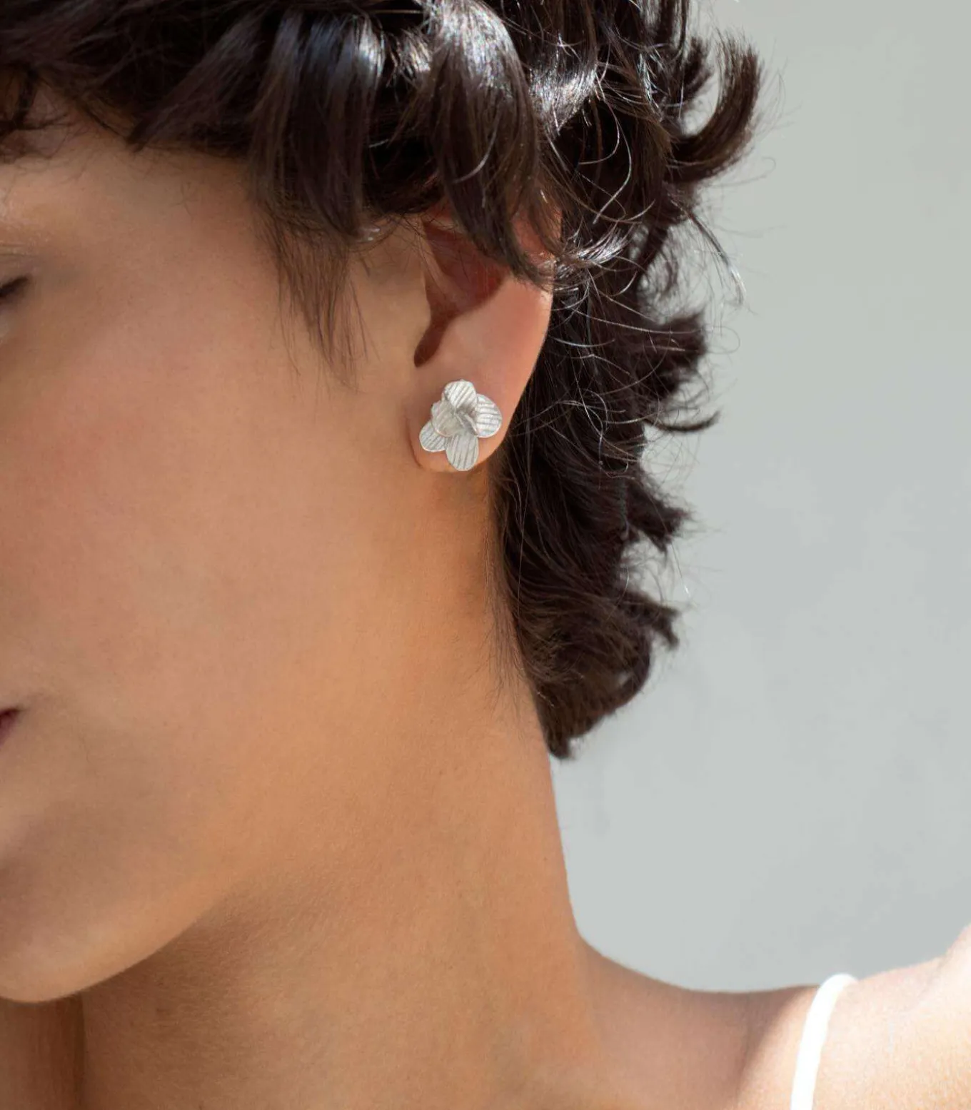 Oorbellen van 925 zilver met een platina coating die hulde brengen aan de vergankelijke schoonheid van de wilde pioenroos uit Mallorca. Textuurontwerp dat kunst en natuur met elkaar verbindt. Vlindersluiting.