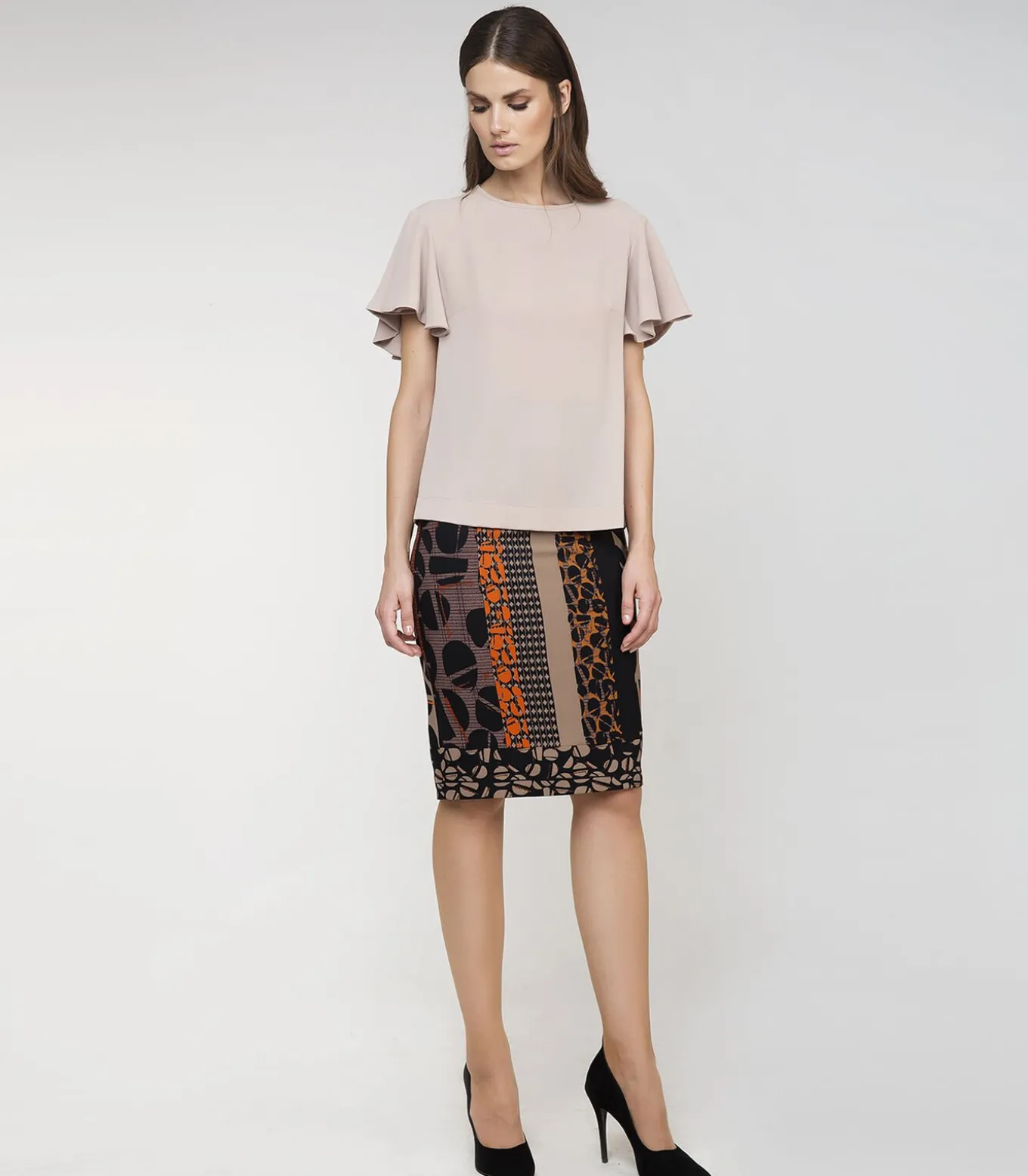 Kokerrok met een allover print van polyester–elastaanstof. Brede zoom van dezelfde stof. Dikke plastic ritssluiting aan de achterkant. Klein splitje aan de achterkant. Polyester voering. Lengte: 66 cm voor maat 36. Ons model is 178 cm en draagt maat 36.