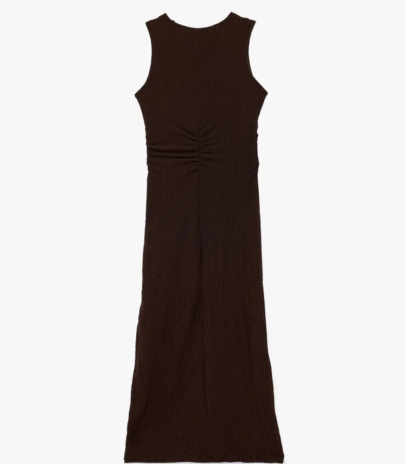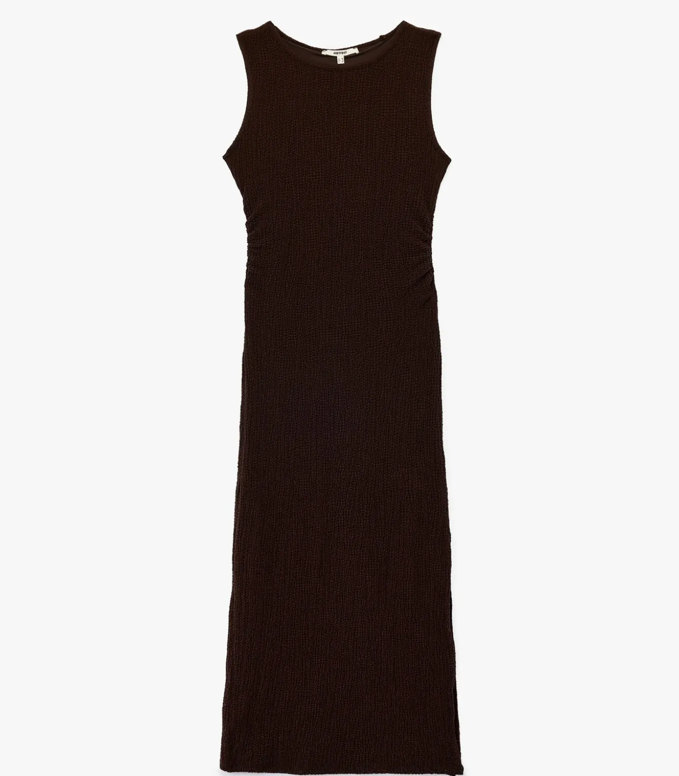 Koton Textured draped wide round neck sleeveless midi column dress.