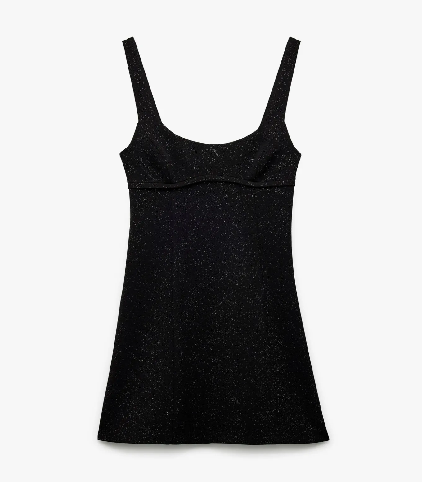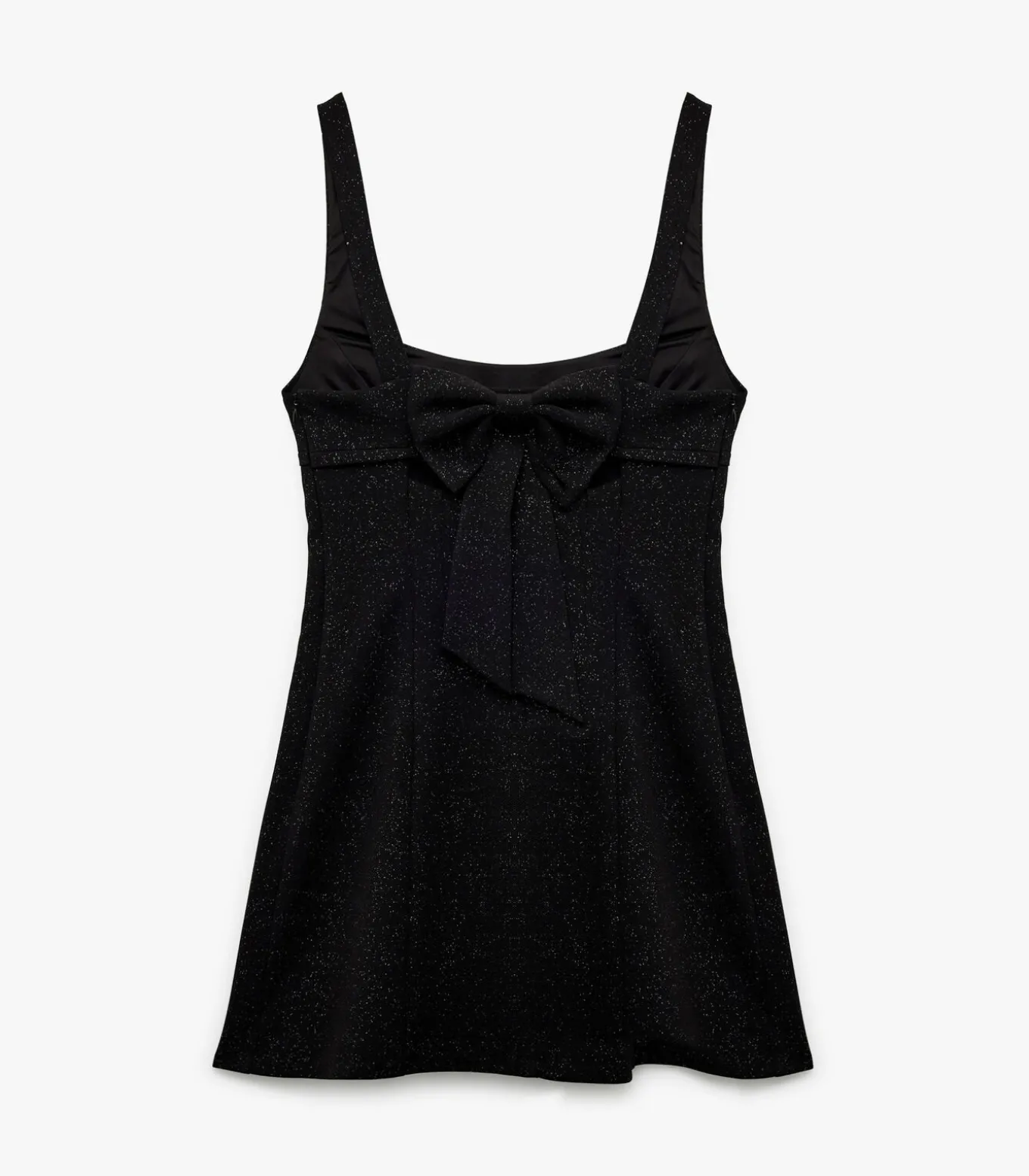 Koton Glitter bow detail square neck sleeveless mini evening dress. Due to glitter fabric of this product, glitter may be dispersed during usage and cleaning.