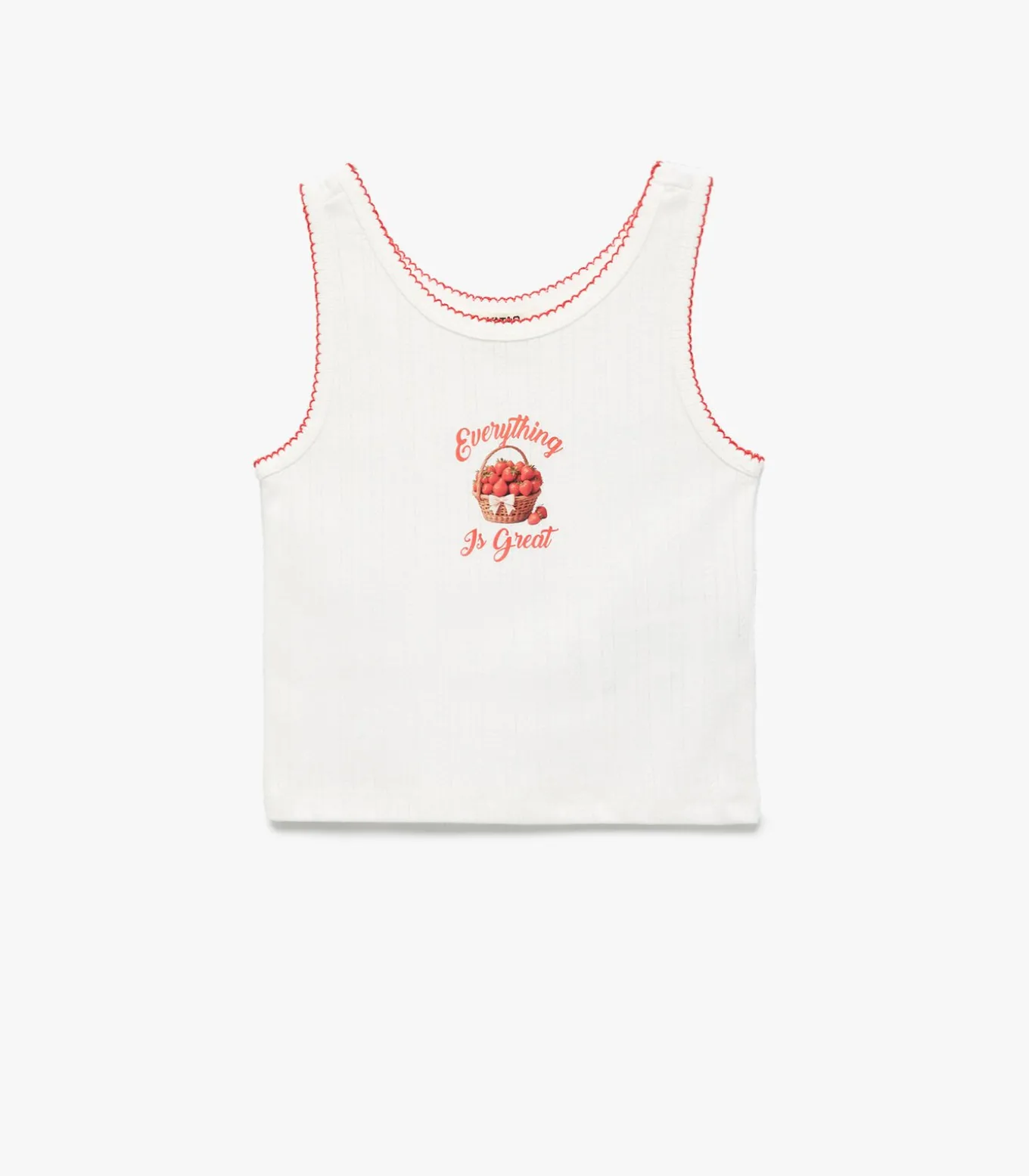Strawberry printed, crew neck, sleeveless tank top.