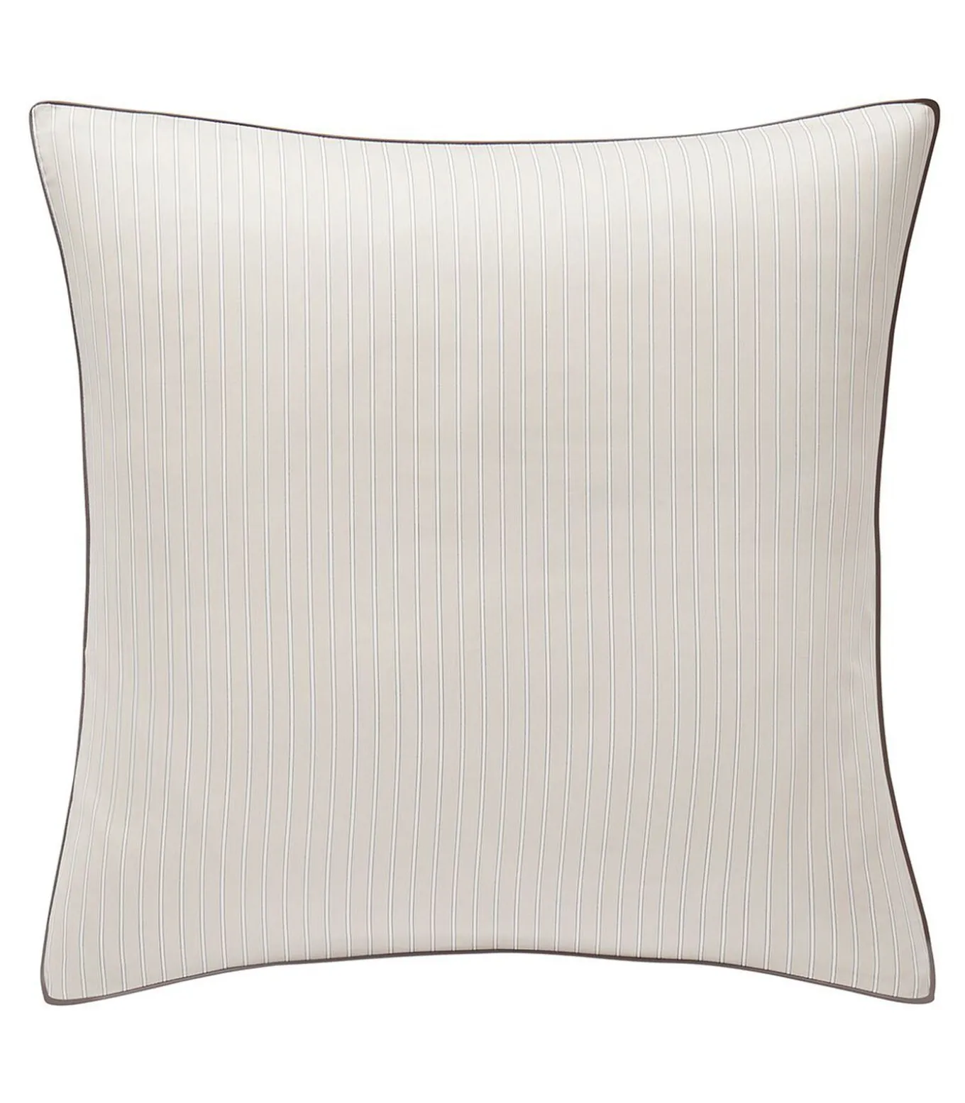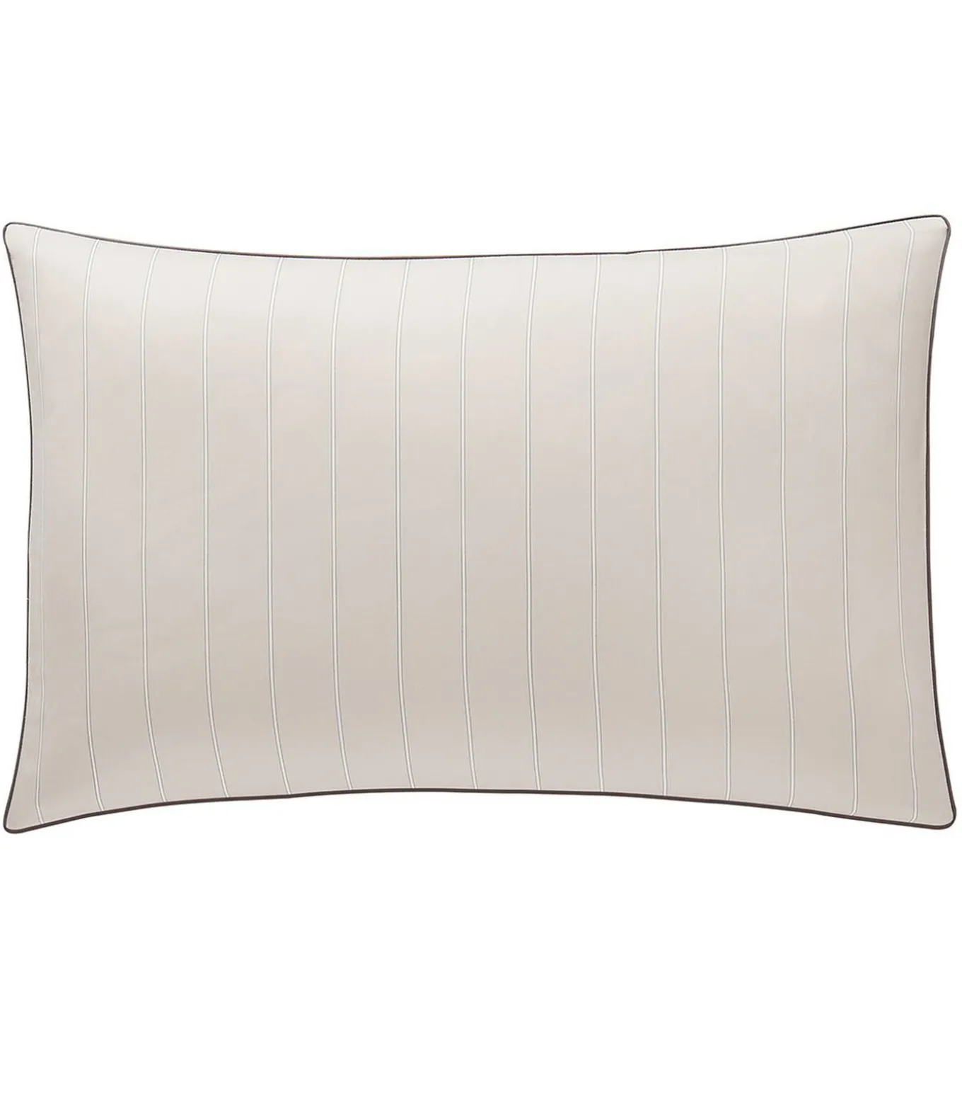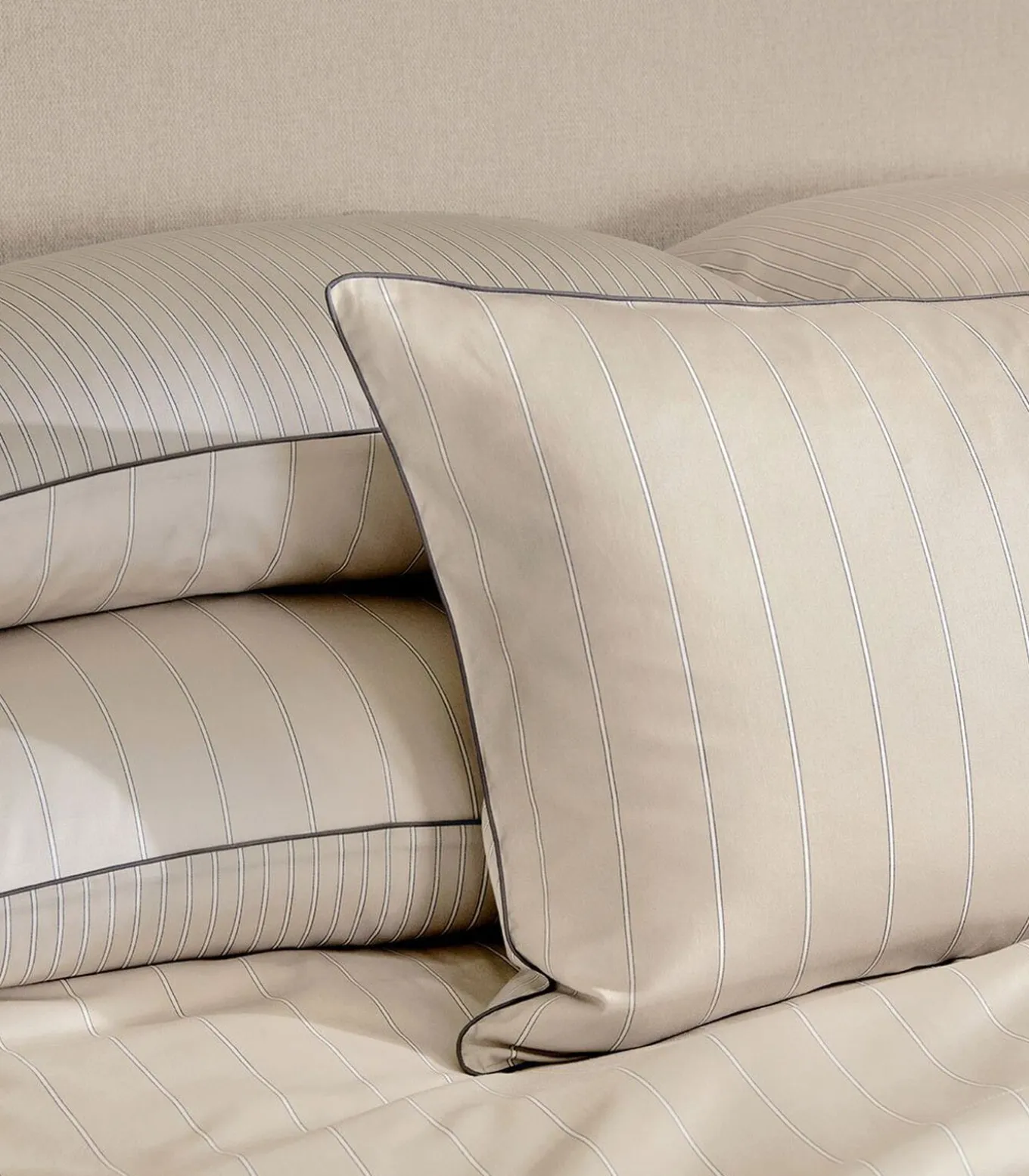 Voorzijde bedrukt met brede verticale strepen op een grègekleurige achtergrond.Keerzijde bedrukt met fijne verticale strepen op een grègekleurige achtergrond.Omkeerbare kussensloop met dubbele overslag.Afgewerkt met een grijze paspel.
