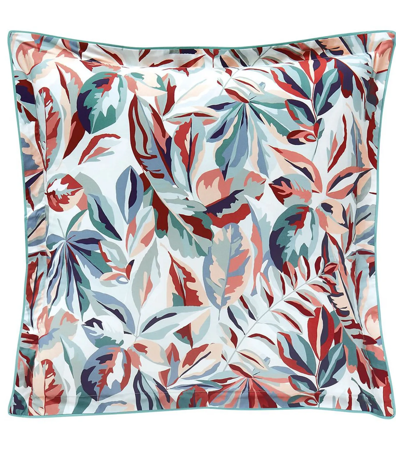Meerkleurige exotische bladerenprintAchterkant met diagonale streepprint op een lichtgroene achtergrond.Sloop met platte volant van 3,5 cm.Afwerking met groene bies.