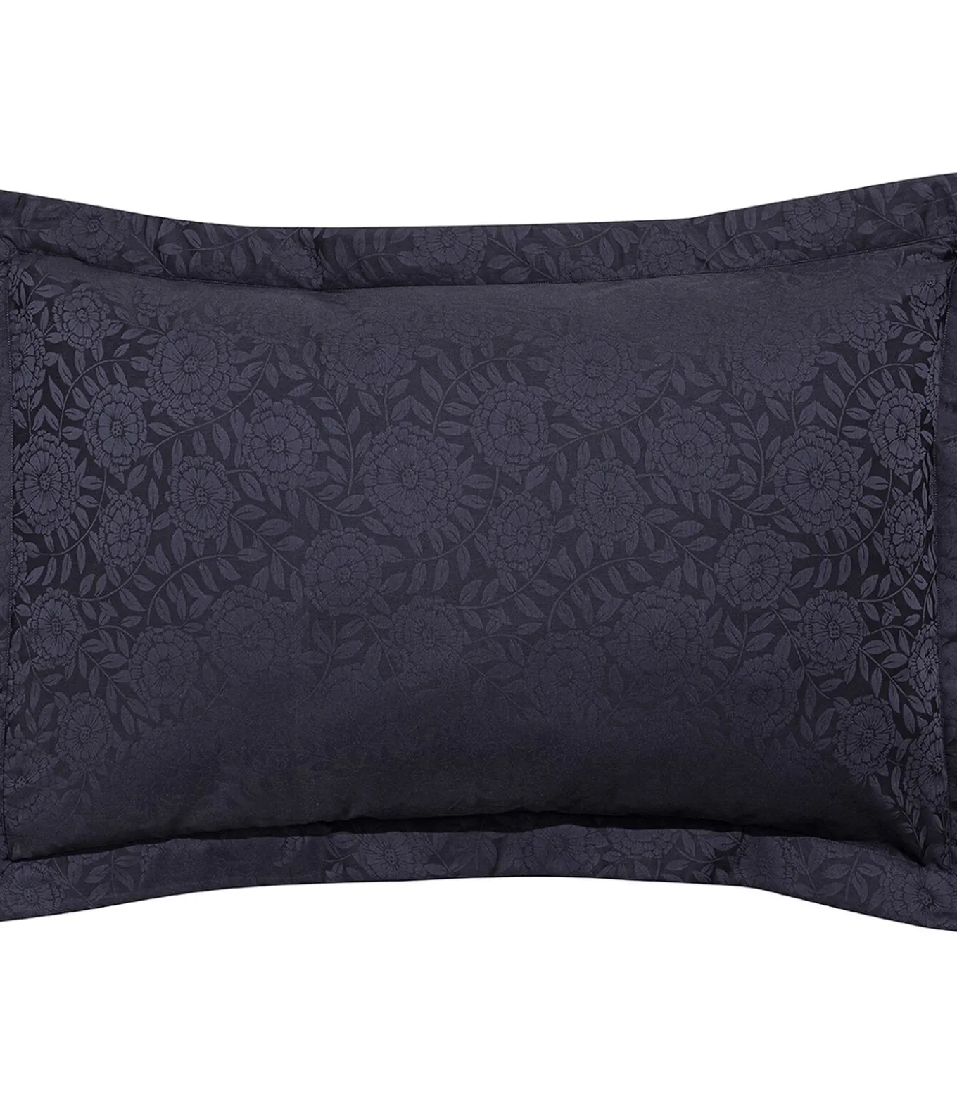 Decoratieve kussensloop versierd met decoratieve zinnia’s, doorweven met gebladerte in een delicaat middernachtblauw damast. Elegant en verfijnd, voegen ze een gezellige en rustgevende sfeer toe aan je slaapkamer.
