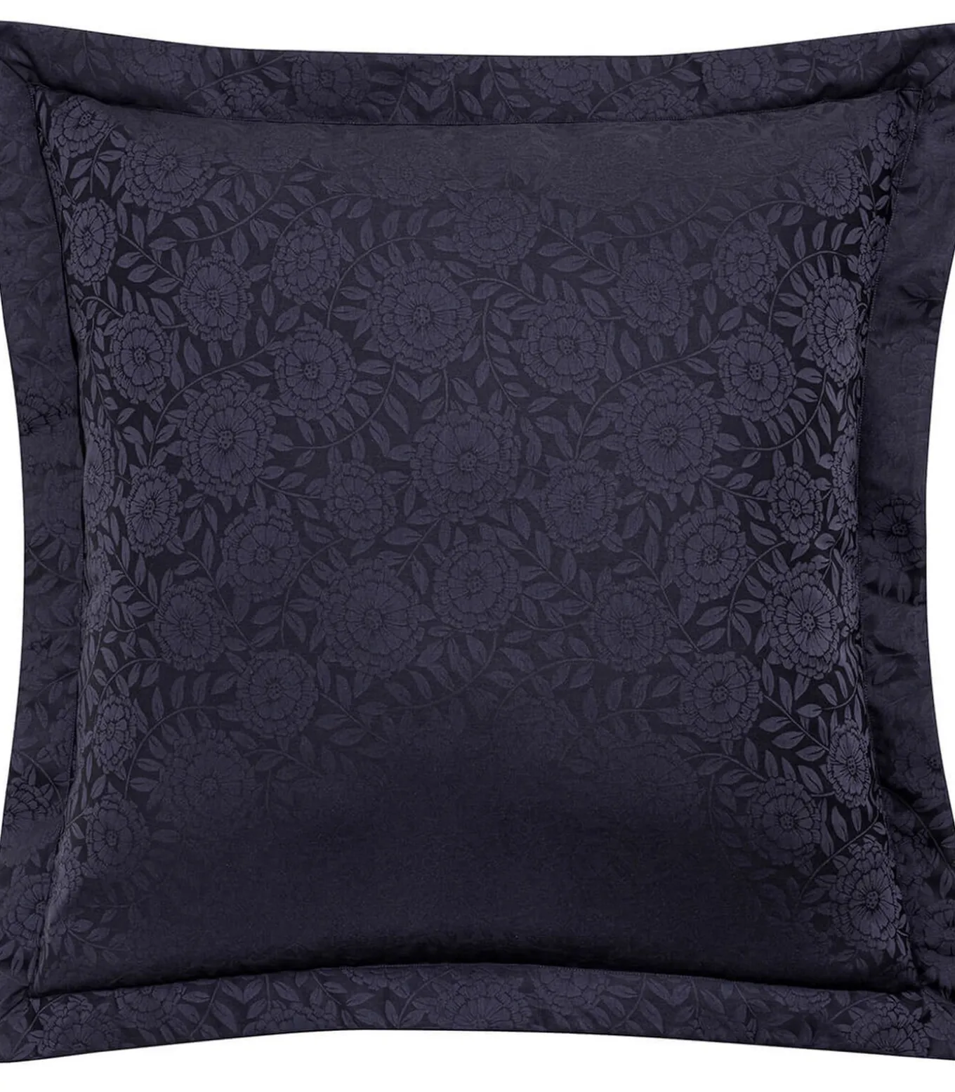 Kussenslopen versierd met decoratieve zinnia’s, doorweven met gebladerte in een delicaat middernachtblauw damast. Elegant en verfijnd, voegen ze een gezellige en rustgevende sfeer toe aan uw slaapkamer.