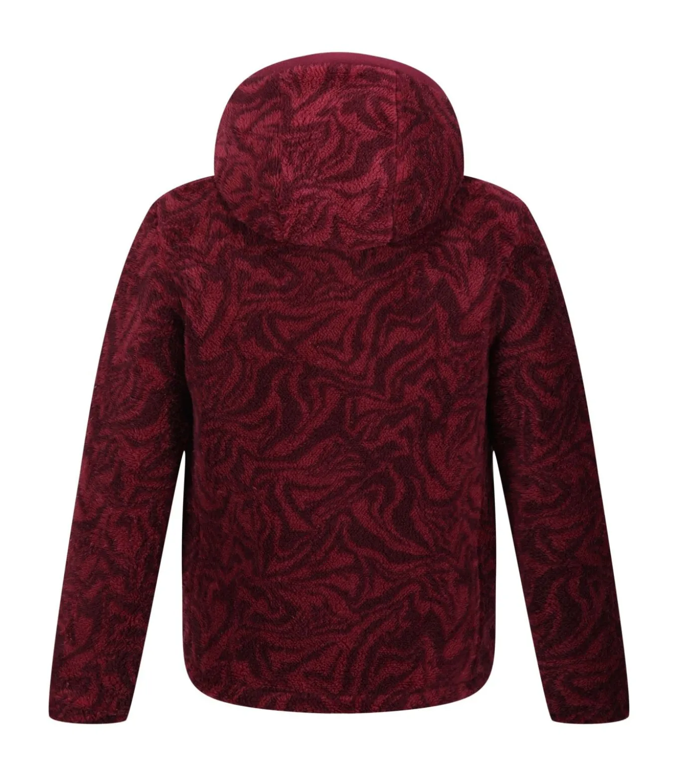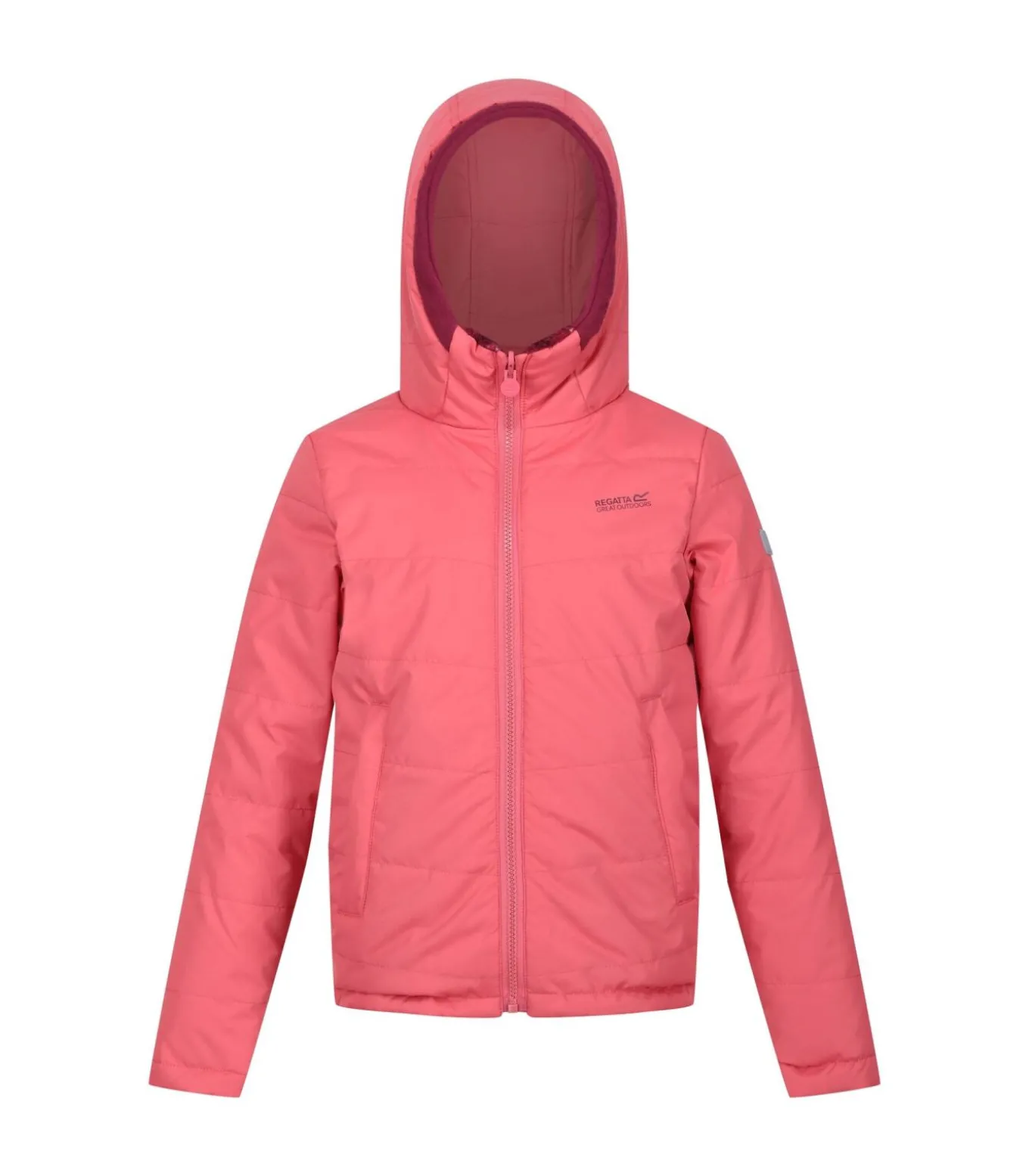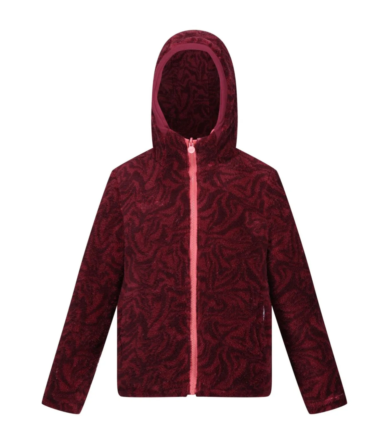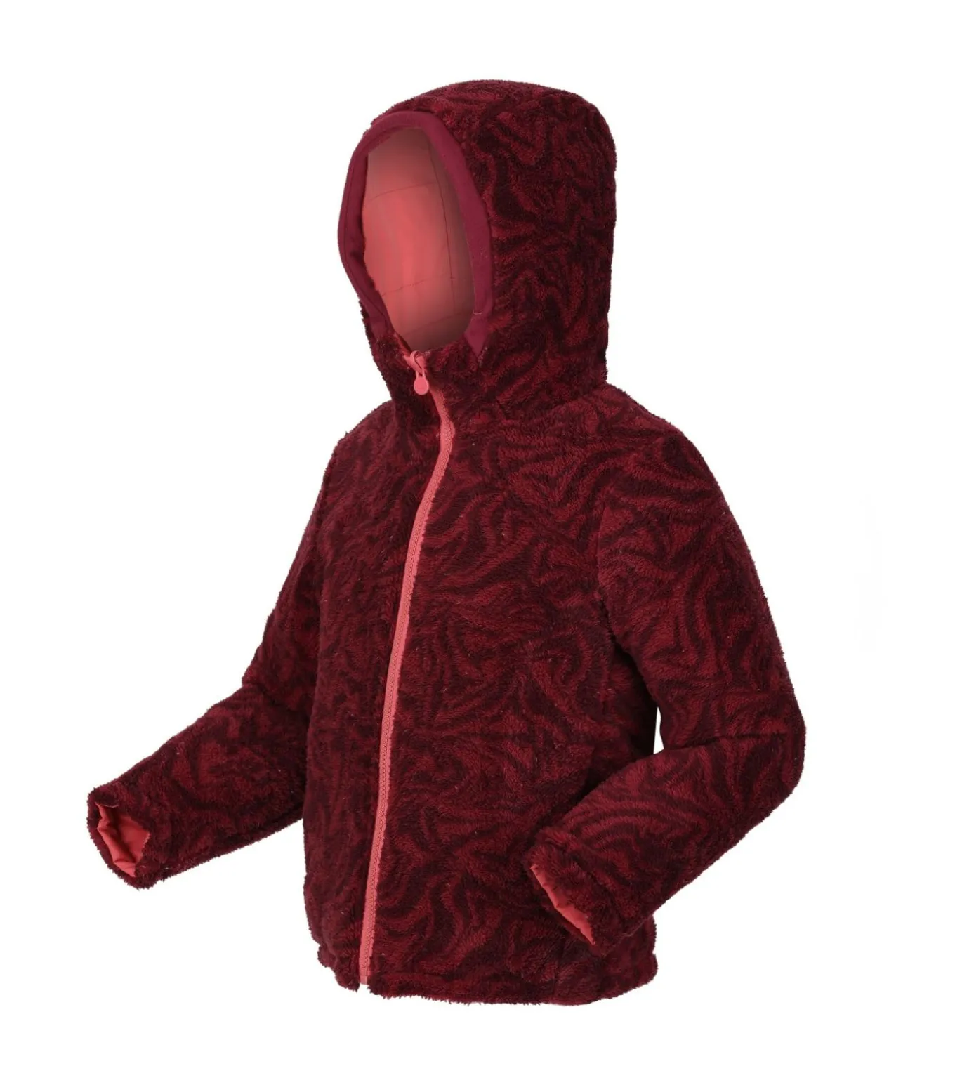 Deze productomschrijving betreft een omkeerbaar kinderjack van Regatta. De jas heeft een zebraprint en is gemaakt van 100% polyester materialen. De buitenstof bestaat uit borg en fleece met een zachte touch. Het heeft logo’s en doorgestikte motieven naast de zebraprint. De stof weegt 200 gsm. Technische aspecten van de stof zijn een DWR–afwerking om water tegen te houden, isolerende eigenschappen, snelle droogtijd, thermo–guard temperatuurregulatie en waterafstotendheid. De hals heeft een capuchon. De mouwen zijn lang. Extra functies zijn wattering, reflecterende afwerking en omkeerbaarheid zodat je twee stijlen kunt dragen. De capuchon zelf is vastgemaakt met elastische boorden. Voor het opbergen zijn er twee zijzakken en twee onderzakken. De rits sluit over de hele lengte.