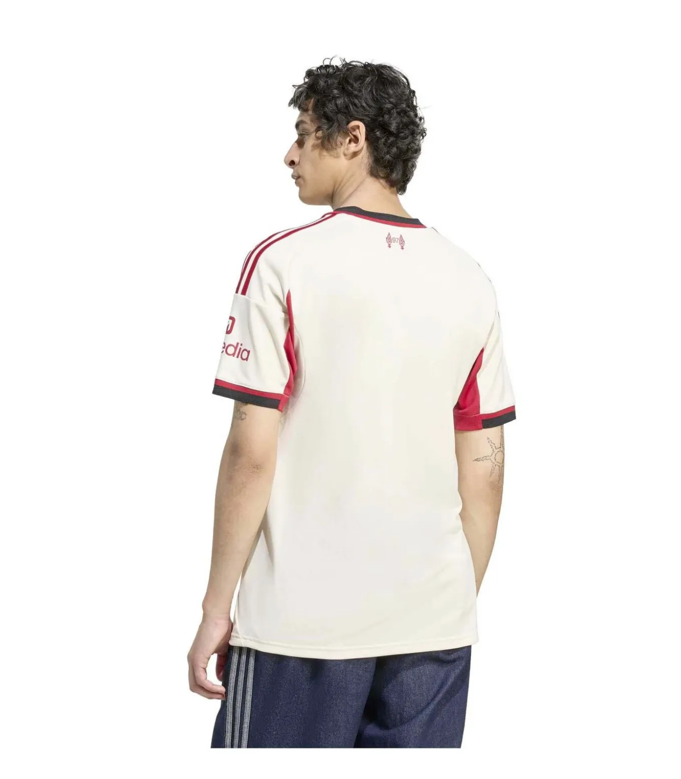 Kleur: Wonder White. Samenstelling: 100% gerecycled polyester. Mouwen: kort. Halslijn: V–hals. Pasvorm: slim fit. Details: Liverpool FC–embleem geïnspireerd op de gebogen puntgevel van de hoofdtribune, ademende Aeroready–technologie. Duurzaamheid: volledig gemaakt van gerecycled polyester om afval en het gebruik van niet–hernieuwbare grondstoffen te verminderen. Gebruik: officieel Liverpool FC 25/26 uitshirt, ideaal om te juichen en in je vrije tijd.