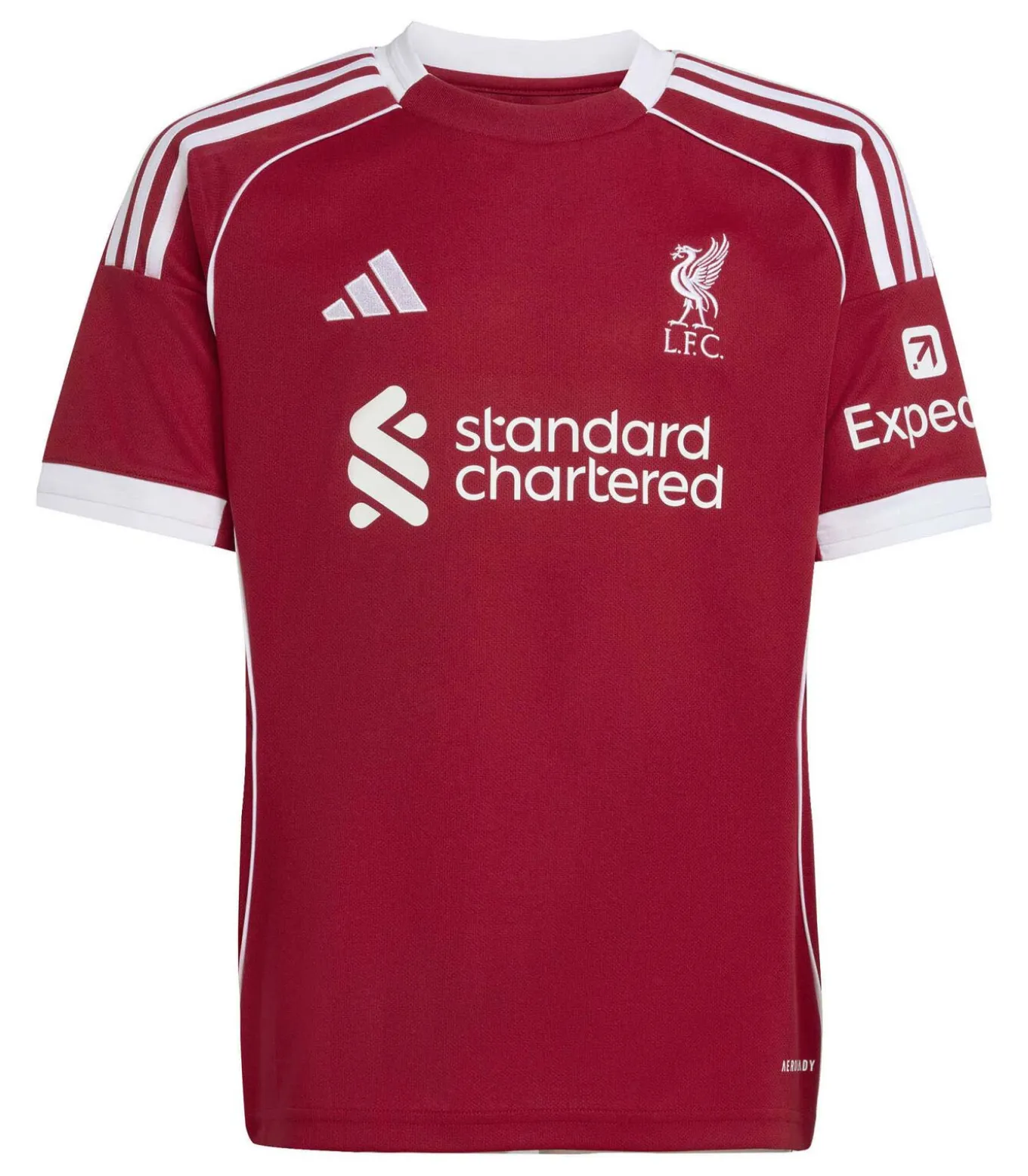 Kleur: Aardbeirood. Samenstelling: 100% gerecycled polyester. Mouwen: Kort. Halslijn: Ronde hals. Pasvorm: Regular Fit. Details: Liverpool FC–logo geborduurd op de borst, contrasterende witte inzetstukken, ademende Aeroready–technologie. Duurzaamheid: Volledig gemaakt van gerecycled polyester om afval en het gebruik van niet–hernieuwbare grondstoffen te verminderen. Gebruik: Officieel Liverpool FC 25/26 kinderthuisshirt, ontworpen om te juichen en in je vrije tijd.