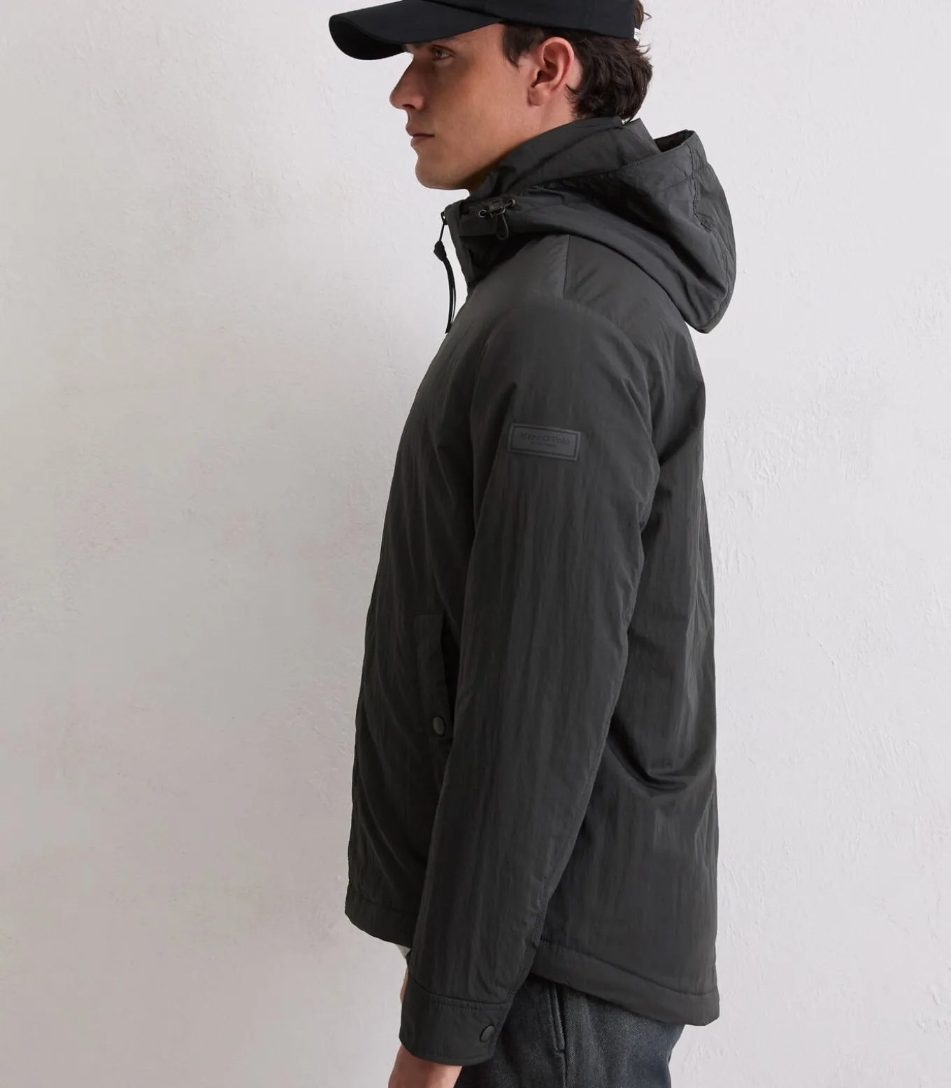 Licht gewatteerd outdoorjack van waterafstotend polyamide met een aangenaam antislip, licht onregelmatig oppervlak. Aan de binnenkant zorgt een gladde, gewatteerde nylon voering met contrasterende logoprint en lichtgewicht Unifi REPREVE® vulling voor comfort. Opstaande kraag met zachte gebreide inzet, afneembare capuchon met elastisch trekkoord en koordstopper, lange mouwen met enkele manchet. Zijzakken met drukknopen, binnenzak met klep en zoom met trekkoord ronden de functionele kenmerken af.