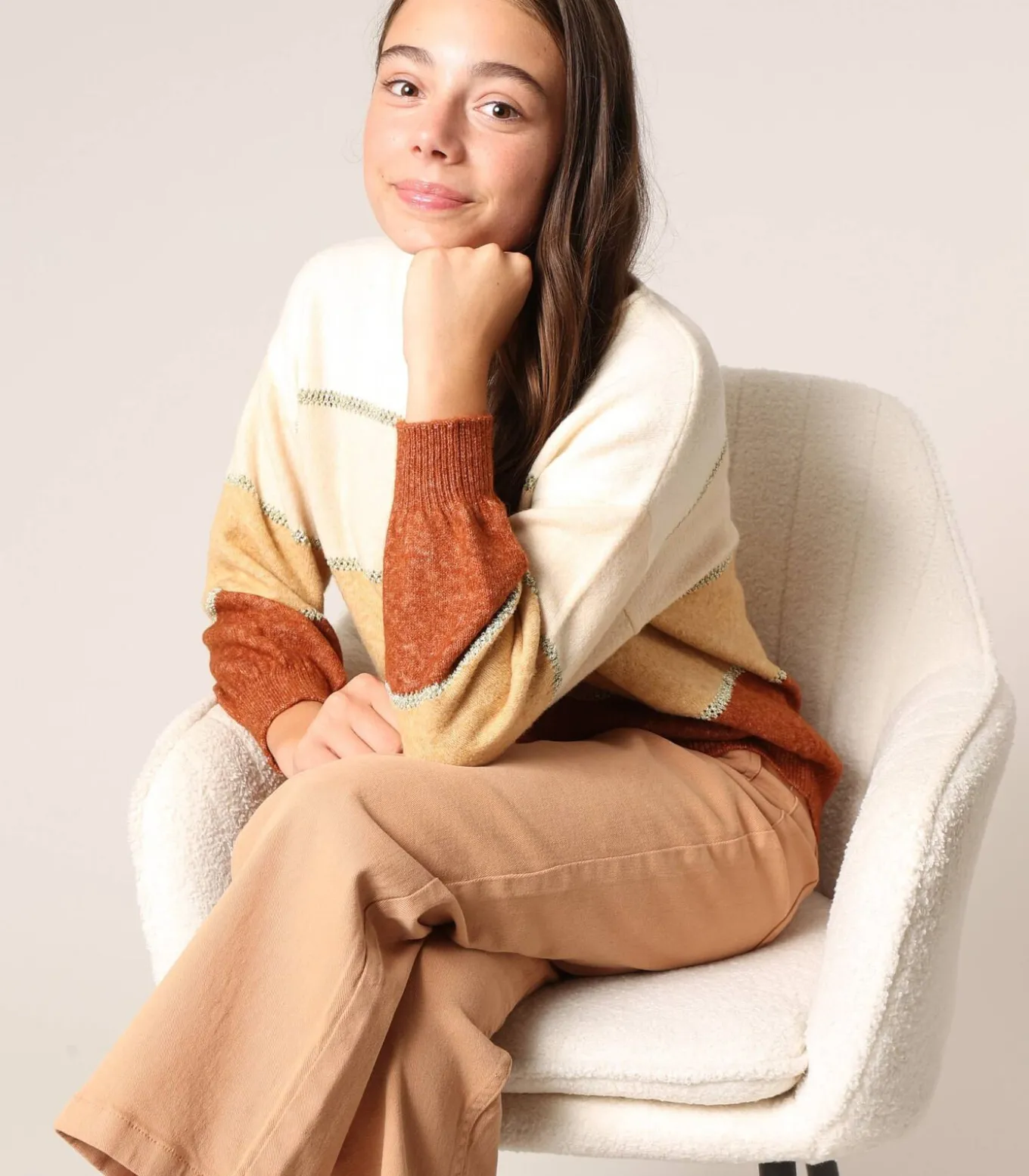 De LODINA–trui voor meisjes valt op door zijn brede strepen en warme of contrasterende kleuren, afhankelijk van de variant. De ronde hals verzacht de houding van het hoofd, terwijl de geribde afwerking zorgt voor een mooie pasvorm van het relaxte model. Hij is gemaakt van een mix met gerecycled materiaal en combineert comfort, esthetiek en een verantwoordelijke aanpak.