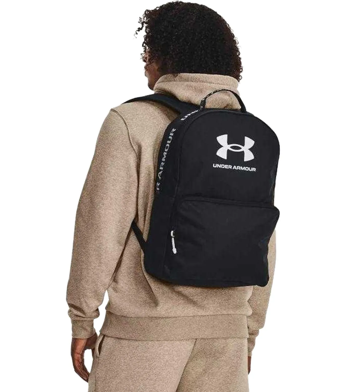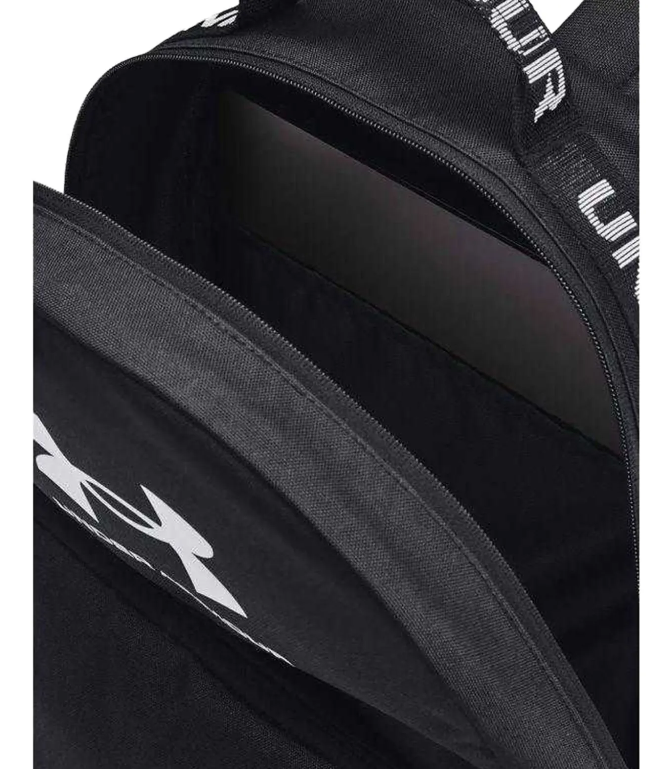 Verkopen we de Under Armour rugzak met logo in zwart. Deze zak is volledig gemaakt van polyester. De hoogte is 17,7 inch, de breedte is 11,8 inch en de lengte is 5,1 inch. Het capaciteit is 25 liter. Dit zakje heeft een voorzak met ritssluiting. Er zijn maar één hoofdcompartiment en één compartment om een laptop van 15″ in te plaatsen. Deze zak bevat merkweefsel, ergonomische rug, schouderriem, handgreep en een eenvoudig logo ontwerp. De zak is tweewegveilig vastgezet. De stof technologie die gebruikt wordt is de UA Storm Technologie, deze is waterafstotend.