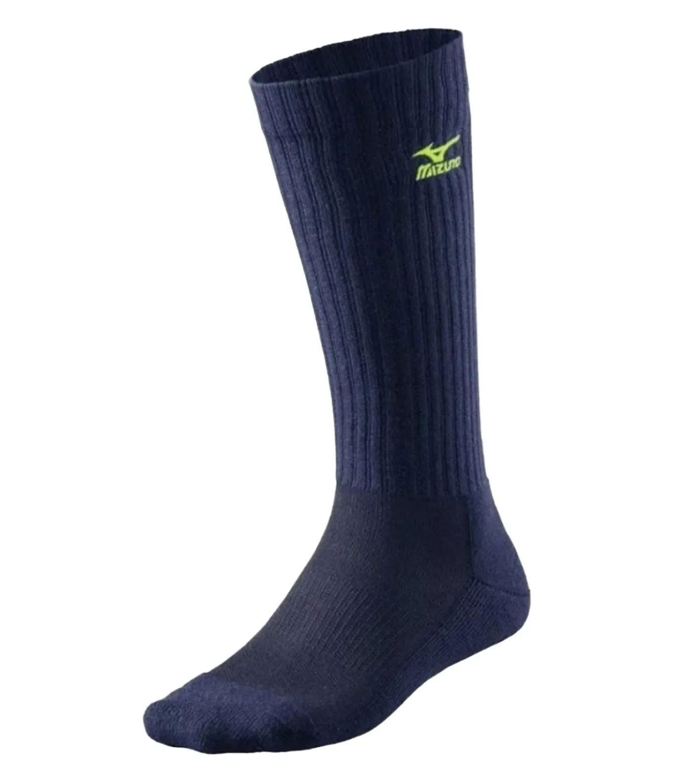 Mizuno–merk product is een paar witte sokken met het merklogo. Het materiaal bestaat uit katoen en polyester. Het ontwerp is zo ontworpen dat er een logo zichtbaar wordt. Deze sokken zijn lang in lengte.